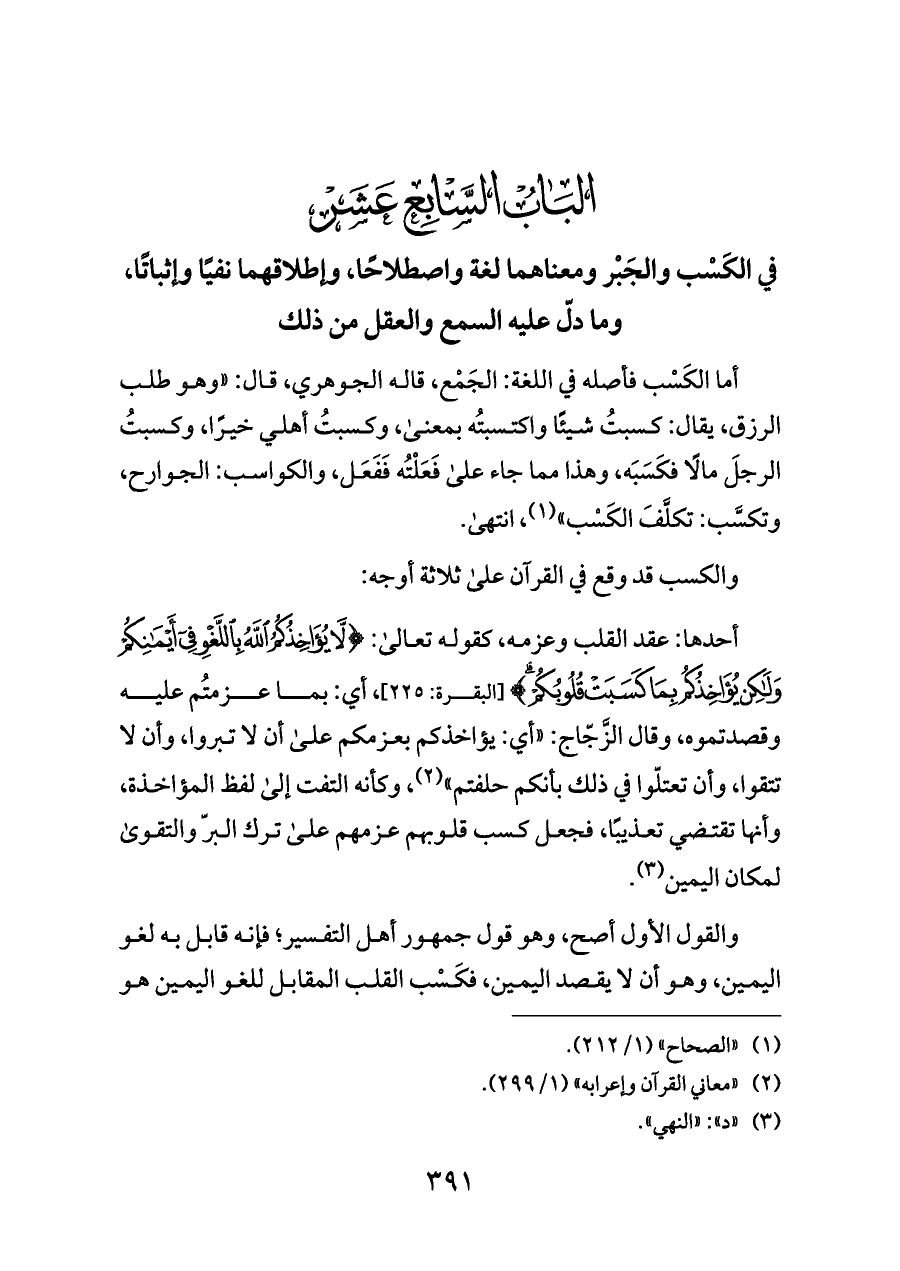 في الكَسْب والجَبْر ومعناهما لغة واصطلاحًا، وإطلاقهما نفيًا وإثباتًا، وما دلّ عليه السمع والعقل من ذلك