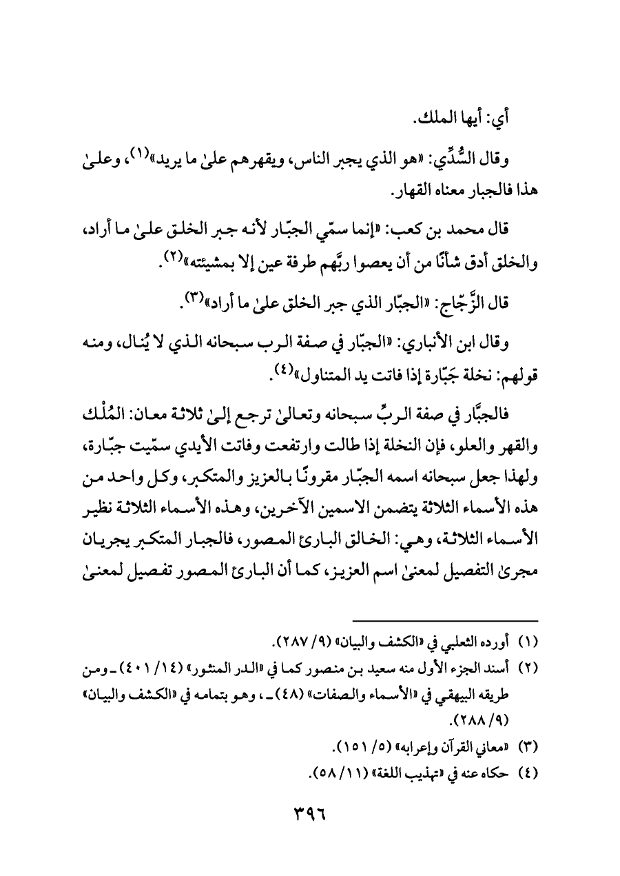 قال محمد بن كعب: "إنما سمّي الجبّار لأنه جبر الخلق على ما أراد، والخلق أدق شأنًا من أن يعصوا ربَّهم طرفة عين إلا بمشيئته" (¬٢).