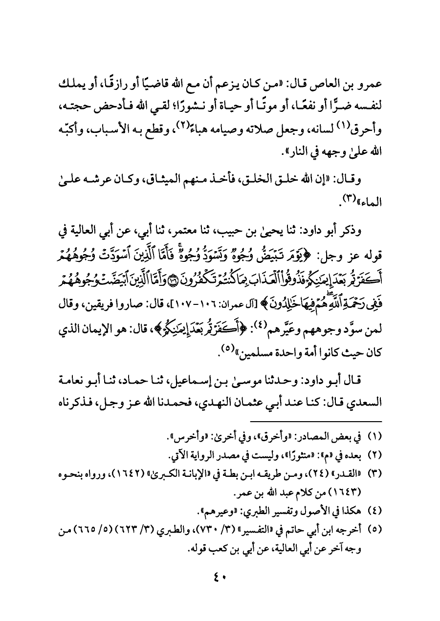وذكر أبو داود: ثنا يحيى بن حبيب، ثنا معتمر، ثنا أبي، عن أبي العالية في قوله عز وجل: {يَوْمَ تَبْيَضُّ وُجُوهٌ وَتَسْوَدُّ وُجُوهٌ فَأَمَّا الَّذِينَ اسْوَدَّتْ وُجُوهُهُمْ أَكَفَرْتُمْ بَعْدَ إِيمَانِكُمْ فَذُوقُوا الْعَذَابَ بِمَا كُنْتُمْ تَكْفُرُونَ (١٠٦) وَأَمَّا الَّذِينَ ابْيَضَّتْ وُجُوهُهُمْ فَفِي رَحْمَةِ اللَّهِ هُمْ فِيهَا خَالِدُونَ (١٠٧)} [آل عمران: ١٠٦ - ١٠٧]، قال: صاروا فريقين، وقال لمن سوَّد وجوههم وعَيَّرهم (¬٤): {أَكَفَرْتُمْ بَعْدَ إِيمَانِكُمْ}، قال: هو الإيمان الذي كان حيث كانوا أمة واحدة مسلمين" (¬٥).
