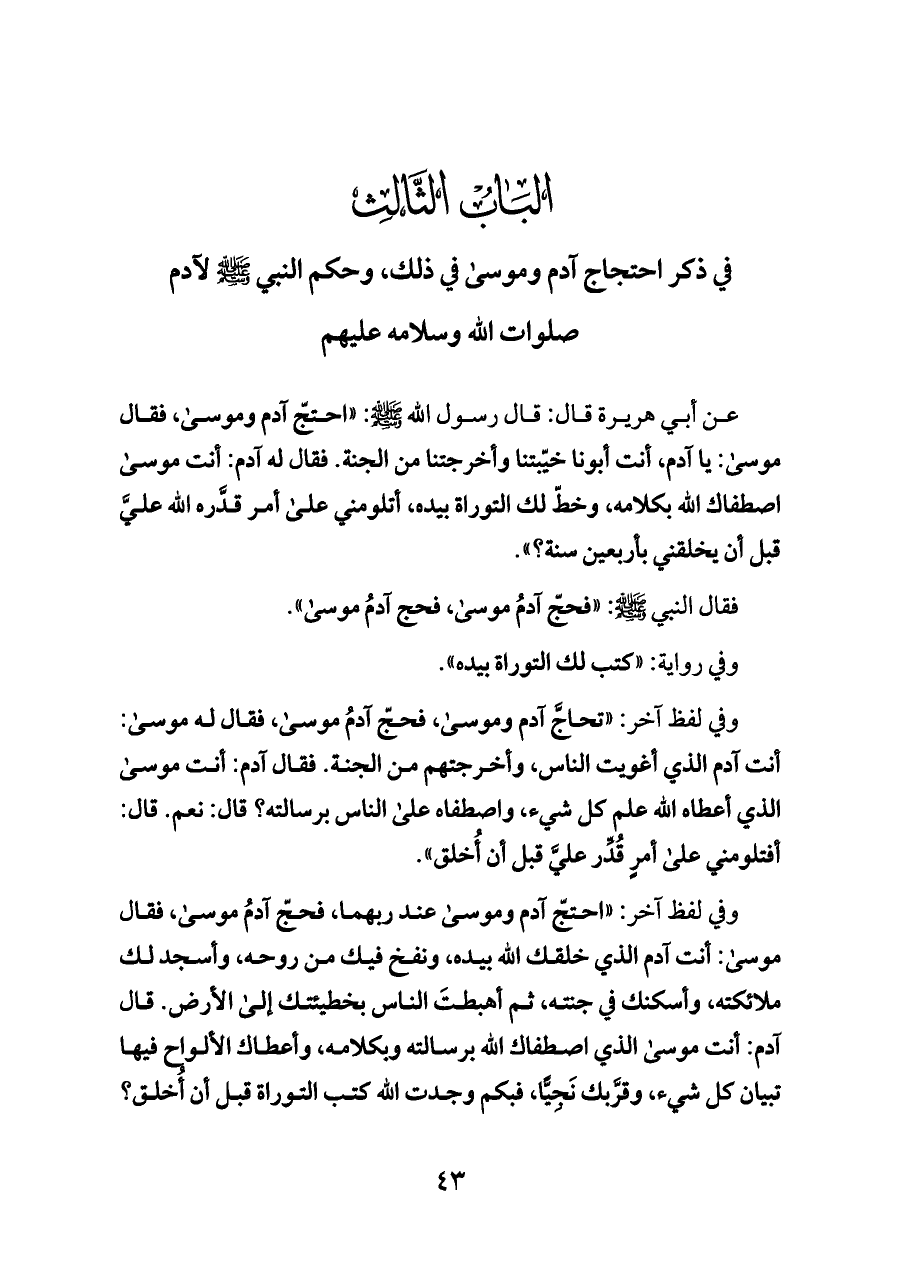 عن أبي هريرة قال: قال رسول الله - صلى الله عليه وسلم -: "احتجّ آدم وموسى، فقال موسى: يا آدم، أنت أبونا خيّبتنا وأخرجتنا من الجنة. فقال له آدم: أنت موسى اصطفاك الله بكلامه، وخطّ لك التوراة بيده، أتلومني على أمر قدَّره الله عليَّ قبل أن يخلقني بأربعين سنة؟ ".