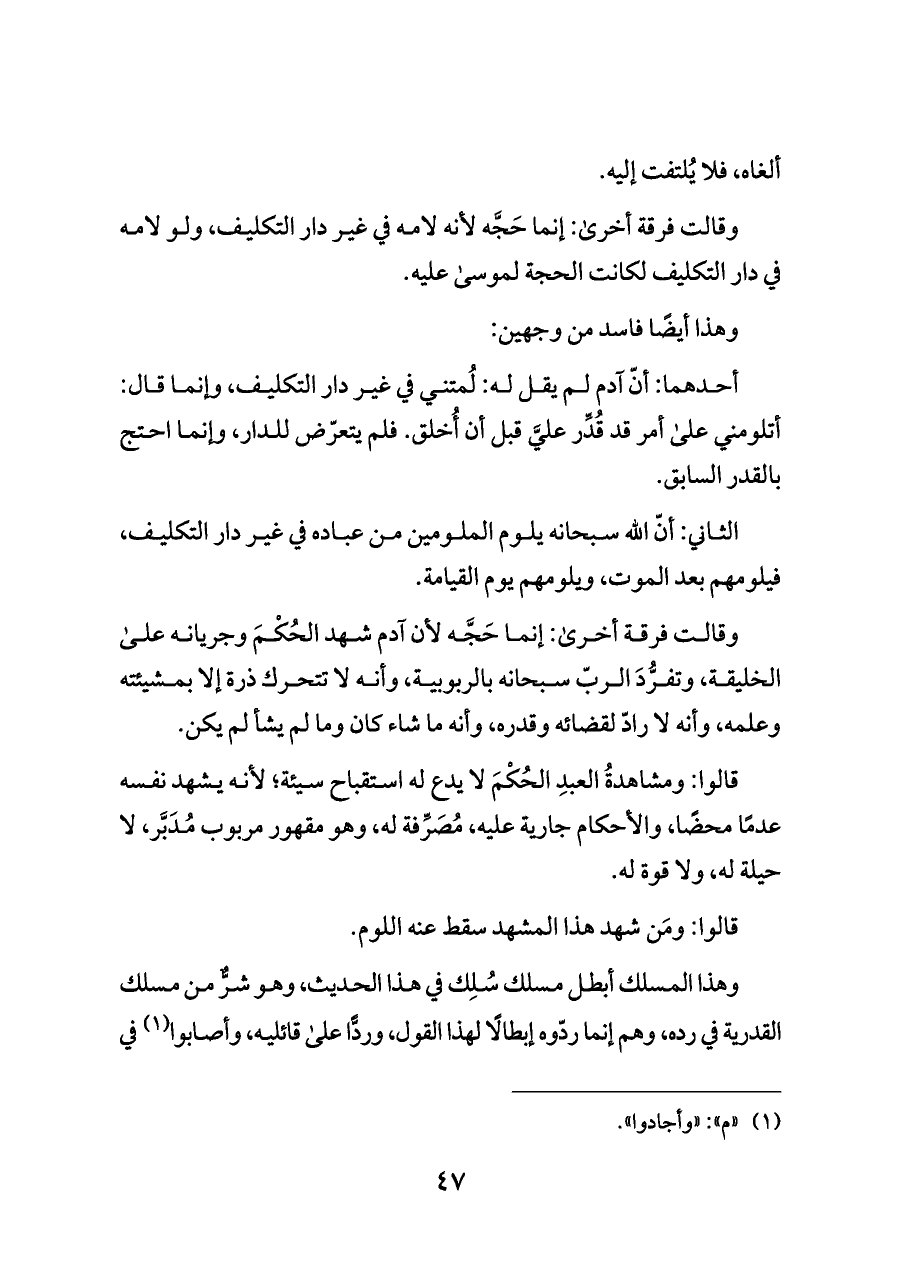 وقالت فرقة أخرى: إنما حَجَّه لأنه لامه في غير دار التكليف، ولو لامه في دار التكليف لكانت الحجة لموسى عليه.