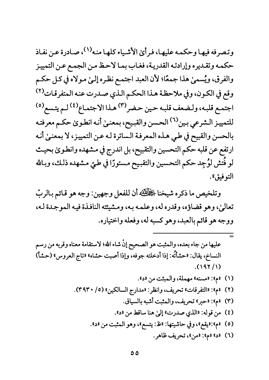 وتصرفه فيها وحكمه عليها، فرأى الأشياء كلها منه (¬١)، صادرة عن نفاذ حكمه وتقديره وإرادته القدرية، فغاب بما لاحظ من الجمع عن التمييز والفرق، ويُسمى هذا جمعًا؛ لأن العبد اجتمع نظره إلى مولاه في كل حكم وقع في الكون، وفي ملاحظة هذا الحكم الذي صدرت عنه المتفرقات (¬٢) اجتمع قلبه، ولضعف قلبه حين حضر (¬٣) هذا الاجتماع (¬٤) لم يتسع (¬٥) للتمييز الشرعي بين (¬٦) الحسن والقبيح، بمعنى أنه انطوى حكم معرفته بالحسن والقبيح في طي هذه المعرفة الساترة له عن التمييز، لا بمعنى أنه ارتفع عن قلبه حكم التحسين والتقبيح، بل اندرج في مشهده وانطوى بحيث لو فُتش لوُجِد حكم التحسين والتقبيح مستورًا في طيّ مشهده ذلك، وبالله التوفيق".