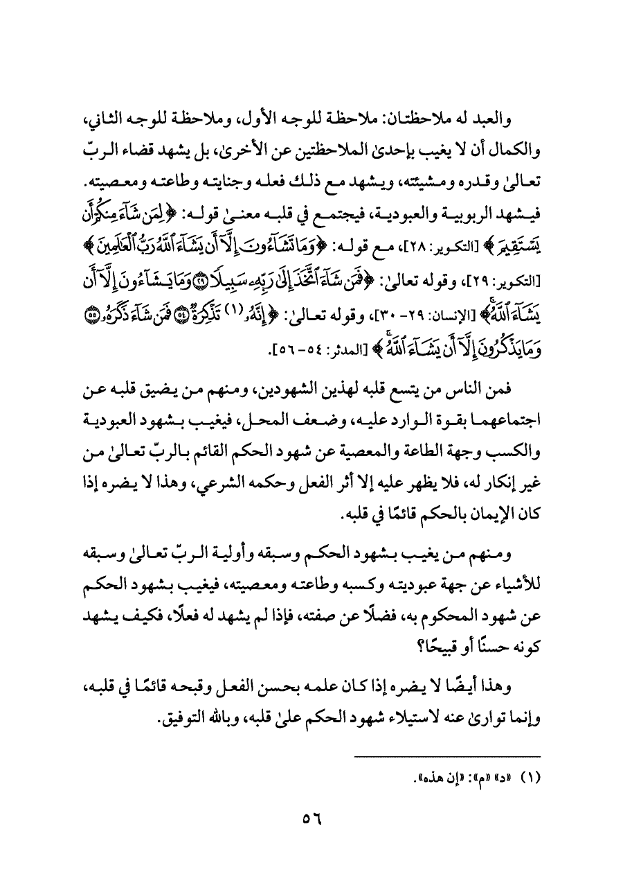 والعبد له ملاحظتان: ملاحظة للوجه الأول، وملاحظة للوجه الثاني، والكمال أن لا يغيب بإحدى الملاحظتين عن الأخرى، بل يشهد قضاء الربّ تعالى وقدره ومشيئته، ويشهد مع ذلك فعله وجنايته وطاعته ومعصيته. فيشهد الربوبية والعبودية، فيجتمع في قلبه معنى قوله: {لِمَنْ شَاءَ مِنْكُمْ أَنْ يَسْتَقِيمَ} [التكوير: ٢٨]، مع قوله: {وَمَا تَشَاءُونَ إِلَّا أَنْ يَشَاءَ اللَّهُ رَبُّ الْعَالَمِينَ} [التكوير: ٢٩]، وقوله تعالى: {فَمَنْ شَاءَ اتَّخَذَ إِلَى رَبِّهِ سَبِيلًا (٢٩) وَمَا يَشَاءُونَ إِلَّا أَنْ يَشَاءَ اللَّهُ} [الإنسان: ٢٩ - ٣٠]، وقوله تعالى: {إِنَّهُ (¬١) تَذْكِرَةٌ (٥٤) فَمَنْ شَاءَ ذَكَرَهُ (٥٥) وَمَا يَذْكُرُونَ إِلَّا أَنْ يَشَاءَ اللَّهُ} [المدثر: ٥٤ - ٥٦].