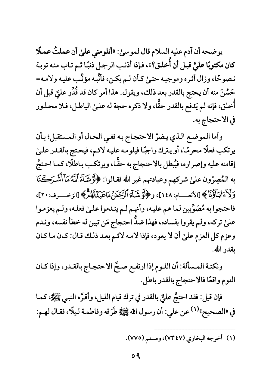 وأما الموضع الذي يضرّ الاحتجاج به ففي الحال أو المستقبل؛ بأن يرتكب فعلًا محرمًا، أو يترك واجبًا فيلومه عليه لائم، فيحتج بالقدر على إقامته عليه وإصراره، فيُبطل بالاحتجاج به حقًّا، ويرتكب باطلًا، كما احتجَّ به المُصِرّون على شركهم وعبادتهم غير الله فقالوا: {لَوْ شَاءَ اللَّهُ مَا أَشْرَكْنَا وَلَا آبَاؤُنَا} [الأنعام: ١٤٨]، و {لَوْ شَاءَ الرَّحْمَنُ مَا عَبَدْنَاهُمْ} [الزخرف:٢٠]، فاحتجوا به مُصَوِّبين لما هم عليه، وأنهم لم يندموا على فعله، ولم يعزموا على تركه، ولم يقروا بفساده، فهذا ضدُّ احتجاج مَن تبين له خطأ نفسه، وندم وعزم كل العزم على أن لا يعود، فإذا لامه لائم بعد ذلك قال: كان ما كان بقدر الله.