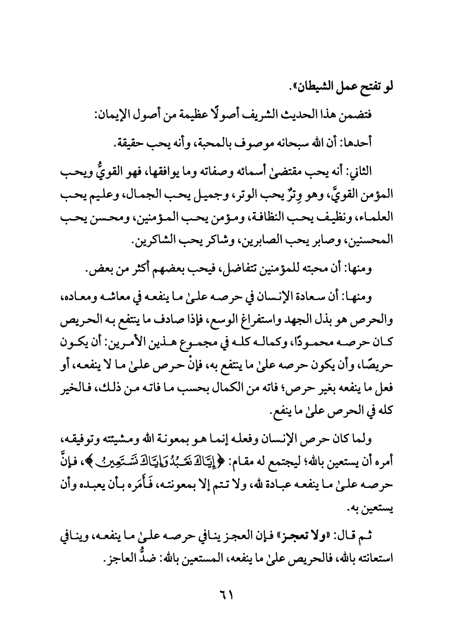 ثم قال: "ولا تعجز" فإن العجز ينافي حرصه على ما ينفعه، وينافي استعانته بالله، فالحريص على ما ينفعه، المستعين بالله: ضدُّ العاجز.