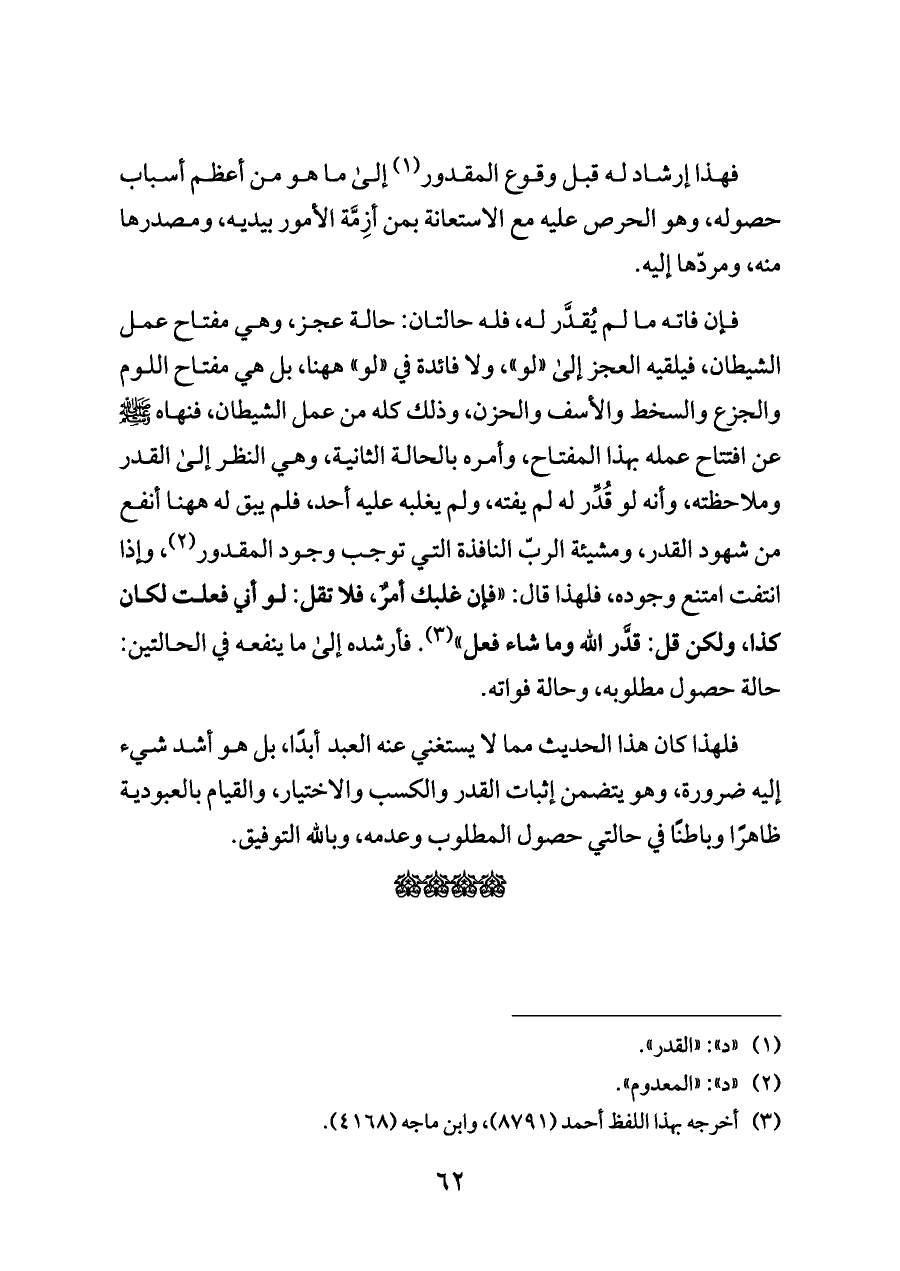 فإن فاته ما لم يُقدَّر له، فله حالتان: حالة عجز، وهي مفتاح عمل الشيطان، فيلقيه العجز إلى "لو"، ولا فائدة في "لو" ههنا، بل هي مفتاح اللوم والجزع والسخط والأسف والحزن، وذلك كله من عمل الشيطان، فنهاه - صلى الله عليه وسلم - عن افتتاح عمله بهذا المفتاح، وأمره بالحالة الثانية، وهي النظر إلى القدر وملاحظته، وأنه لو قُدِّر له لم يفته، ولم يغلبه عليه أحد، فلم يبق له ههنا أنفع من شهود القدر، ومشيئة الربّ النافذة التي توجب وجود المقدور (¬٢)، وإذا انتفت امتنع وجوده، فلهذا قال: "فإن غلبك أمرٌ، فلا تقل: لو أني فعلت لكان كذا، ولكن قل: قدَّر الله وما شاء فعل" (¬٣). فأرشده إلى ما ينفعه في الحالتين: حالة حصول مطلوبه، وحالة فواته.