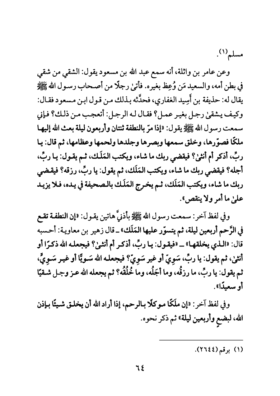 وعن عامر بن واثلة، أنه سمع عبد الله بن مسعود يقول: الشقي من شقي في بطن أمه، والسعيد مَن وُعِظ بغيره. فأتى رجلًا من أصحاب رسول الله - صلى الله عليه وسلم - يقال له: حذيفة بن أَسِيد الغفاري، فحدَّثه بذلك من قول ابن مسعود فقال: وكيف يشقى رجل بغير عمل؟ فقال له الرجل: أتعجب من ذلك؟ فإني سمعت رسول الله - صلى الله عليه وسلم - يقول: "إذا مرّ بالنطفة ثنتان وأربعون ليلة بعث الله إليها ملكًا فصوّرها، وخلق سمعها وبصرها وجلدها ولحمها وعظامها، ثم قال: يا ربِّ، أذكر أم أنثى؟ فيقضي ربك ما شاء، ويكتب المَلَك، ثم يقول: يا ربِّ، أجله؟ فيقضي ربك ما شاء، ويكتب المَلَك، ثم يقول: يا ربِّ، رزقه؟ فيقضي ربك ما شاء، ويكتب المَلَك، ثم يخرج المَلَك بالصحيفة في يده، فلا يزيد على ما أمر ولا ينقص".