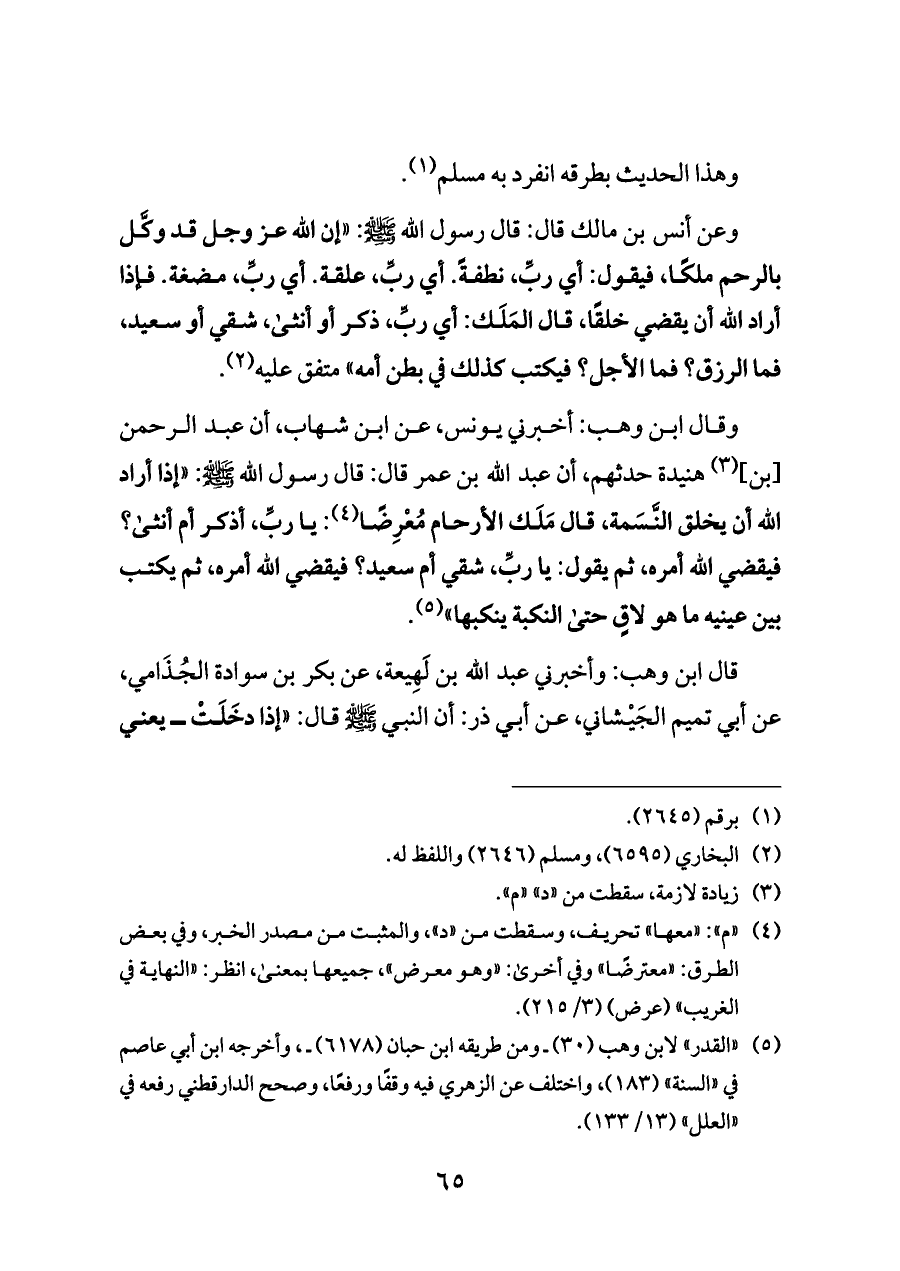 (¬٥) "القدر" لابن وهب (٣٠) ـ ومن طريقه ابن حبان (٦١٧٨) ـ، وأخرجه ابن أبي عاصم في "السنة" (١٨٣)، واختلف عن الزهري فيه وقفًا ورفعًا، وصحح الدارقطني رفعه في "العلل" (١٣/ ١٣٣).