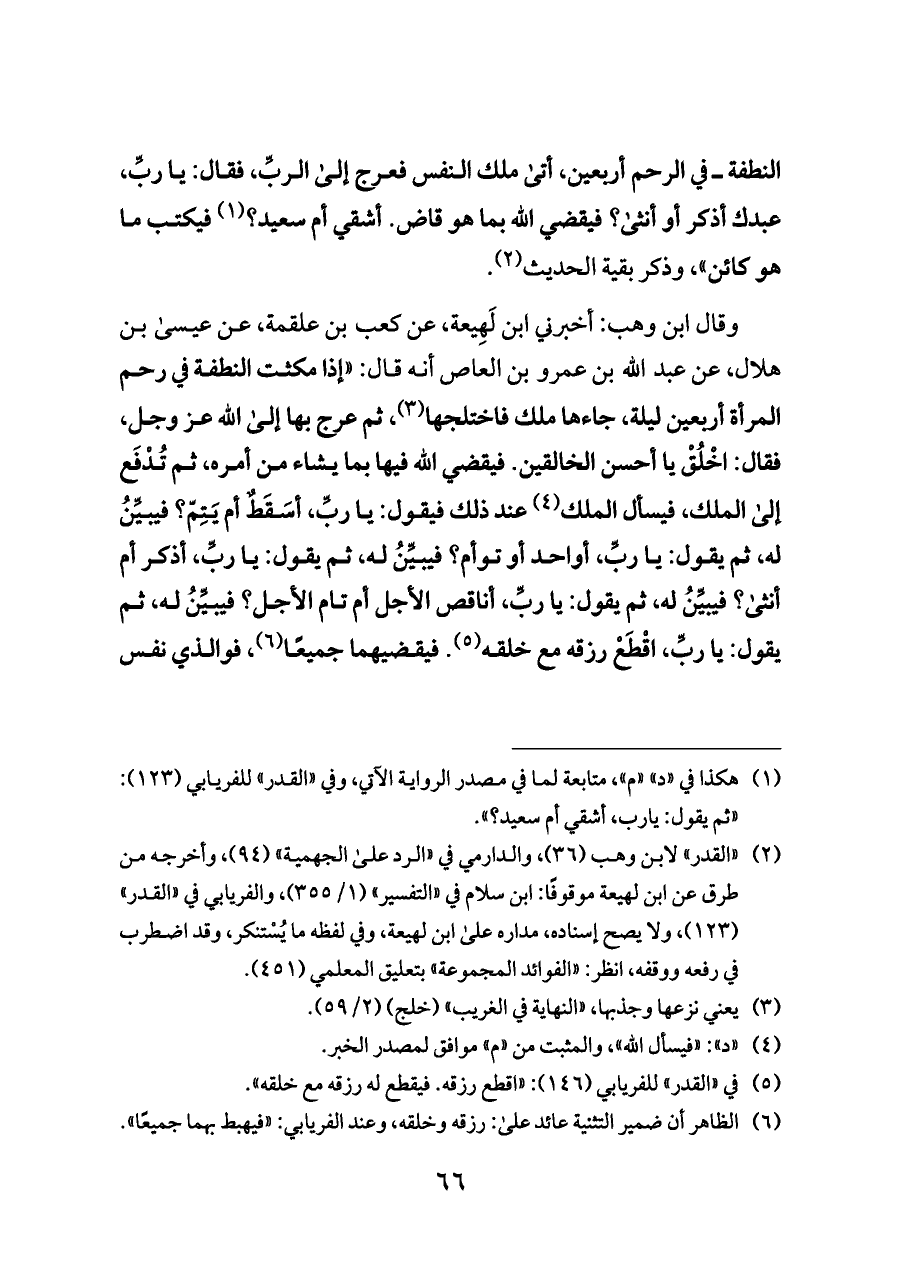 وقال ابن وهب: أخبرني ابن لَهِيعة، عن كعب بن علقمة، عن عيسى بن هلال، عن عبد الله بن عمرو بن العاص أنه قال: "إذا مكثت النطفة في رحم المرأة أربعين ليلة، جاءها ملك فاختلجها (¬٣)، ثم عرج بها إلى الله عز وجل، فقال: اخْلُقْ يا أحسن الخالقين. فيقضي الله فيها بما يشاء من أمره، ثم تُدْفَع إلى الملك، فيسأل الملك (¬٤) عند ذلك فيقول: يا ربِّ، أسَقَطٌ أم يَتِمّ؟ فيبيِّنُ له، ثم يقول: يا ربِّ، أواحد أو توأم؟ فيبيِّنُ له، ثم يقول: يا ربِّ، أذكر أم أنثى؟ فيبيِّنُ له، ثم يقول: يا ربِّ، أناقص الأجل أم تام الأجل؟ فيبيِّنُ له، ثم يقول: يا ربِّ، اقْطَعْ رزقه مع خلقه (¬٥). فيقضيهما جميعًا (¬٦)، فوالذي نفس