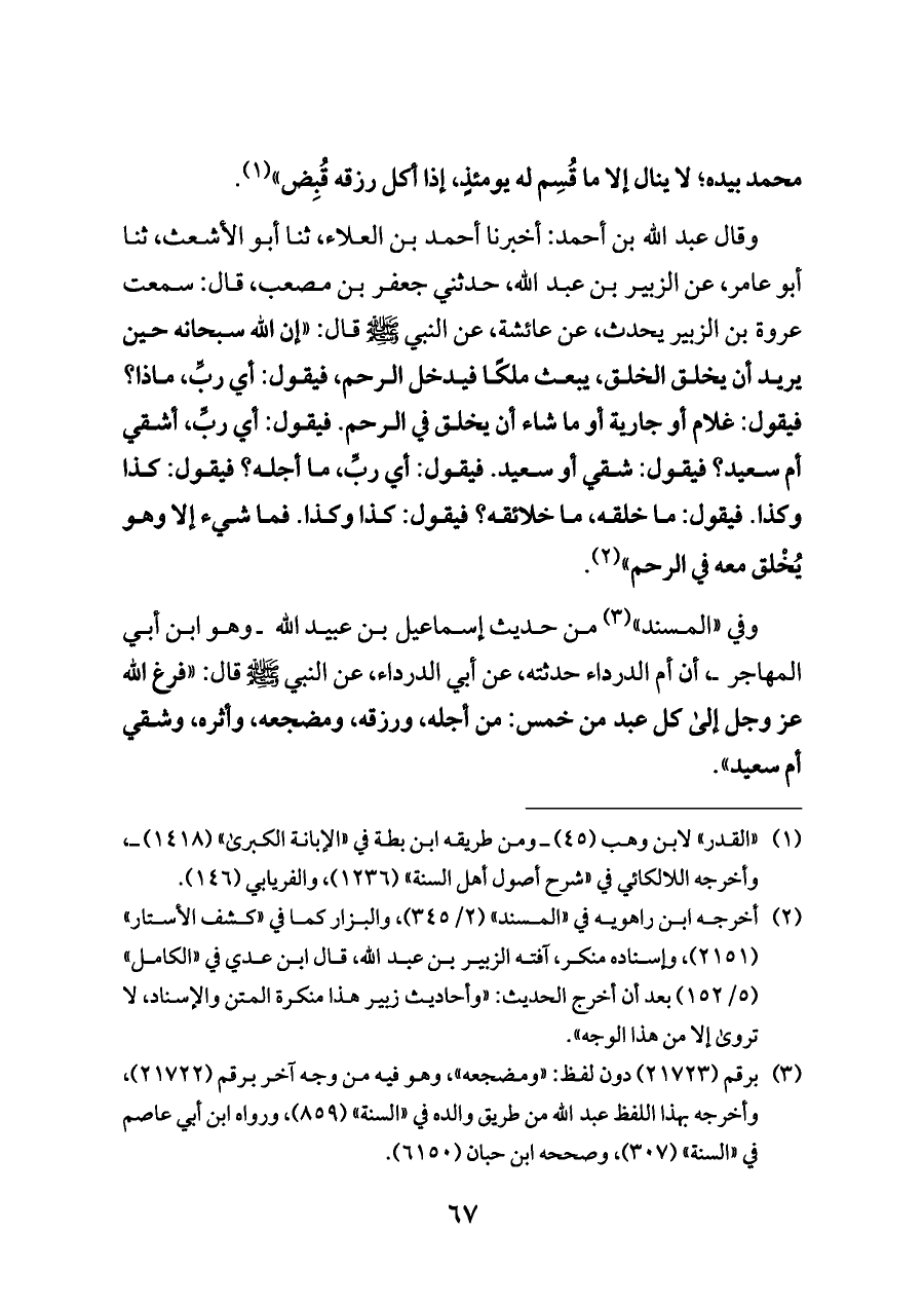 وفي "المسند" (¬٣) من حديث إسماعيل بن عبيد الله ـ وهو ابن أبي المهاجر ـ، أن أم الدرداء حدثته، عن أبي الدرداء، عن النبي - صلى الله عليه وسلم - قال: "فرغ الله عز وجل إلى كل عبد من خمس: من أجله، ورزقه، ومضجعه، وأثره، وشقي أم سعيد".