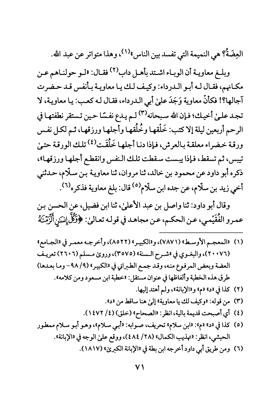 وبلغ معاوية أن الوباء اشتد بأهل داب (¬٢) فقال: "لو حولناهم عن مكانهم، فقال له أبو الدرداء: وكيف لك يا معاوية بأنفس قد حضرت آجالها؟! فكأنّ معاوية وَجَدَ على أبي الدرداء، فقال له كعب: يا معاوية، لا تجد على أخيك؛ فإن الله سبحانه (¬٣) لم يدع نفسًا حين تستقر نطفتها في الرحم أربعين ليلة إلا كتب: خَلْقها وخُلُقها وأجلها ورزقها، ثم لكل نفس ورقة خضراء معلقة بالعرش، فإذا دنا أجلها خَلُقَت (¬٤) تلك الورقة حتى تيبس، ثم تسقط، فإذا يبست سقطت تلك النفس وانقطع أجلها ورزقها"، ذكره أبو داود عن محمود بن خالد، ثنا مروان، ثنا معاوية بن سلّام، حدثني أخي زيد بن سلّام، عن جده ابن سلّام (¬٥) قال: بلغ معاوية فذكره (¬٦).