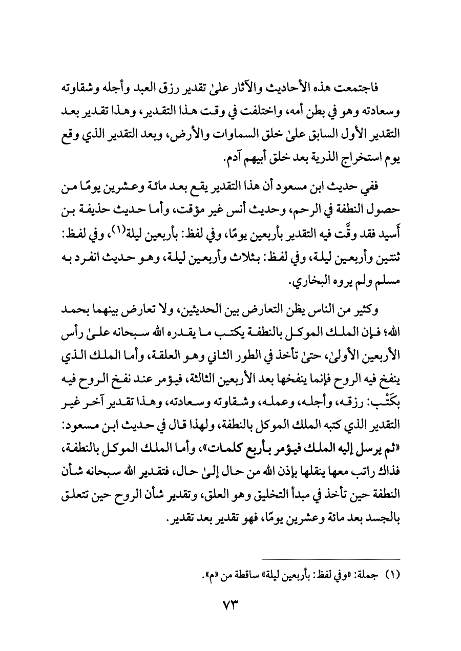 ففي حديث ابن مسعود أن هذا التقدير يقع بعد مائة وعشرين يومًا من حصول النطفة في الرحم، وحديث أنس غير مؤقت، وأما حديث حذيفة بن أَسيد فقد وقَّت فيه التقدير بأربعين يومًا، وفي لفظ: بأربعين ليلة (¬١)، وفي لفظ: ثنتين وأربعين ليلة، وفي لفظ: بثلاث وأربعين ليلة، وهو حديث انفرد به مسلم ولم يروه البخاري.