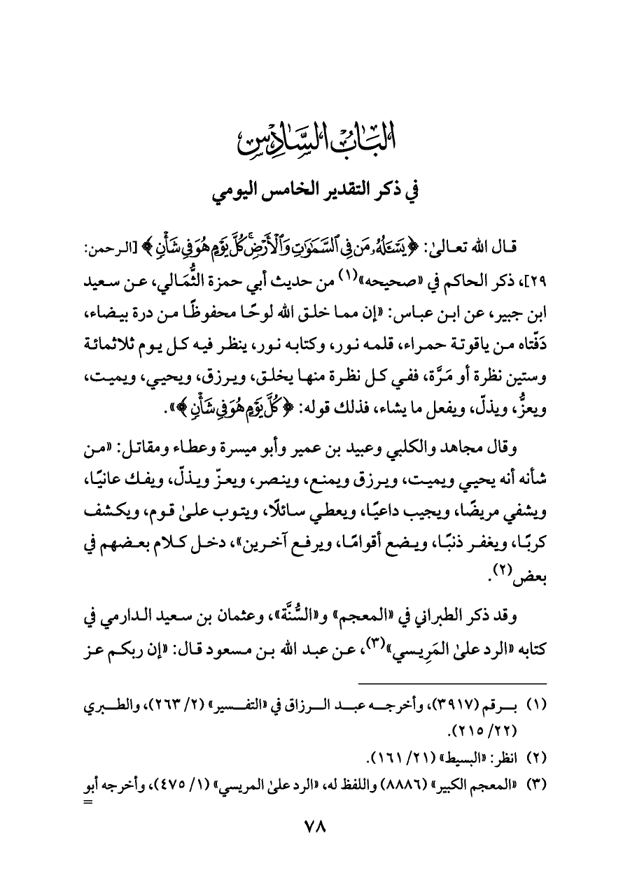 قال الله تعالى: {(٢٨) يَسْأَلُهُ مَنْ فِي السَّمَاوَاتِ وَالْأَرْضِ كُلَّ يَوْمٍ هُوَ فِي} [الرحمن: ٢٩]، ذكر الحاكم في "صحيحه" (¬١) من حديث أبي حمزة الثُّمَالي، عن سعيد ابن جبير، عن ابن عباس: "إن مما خلق الله لوحًا محفوظًا من درة بيضاء، دَفّتاه من ياقوتة حمراء، قلمه نور، وكتابه نور، ينظر فيه كل يوم ثلاثمائة وستين نظرة أو مَرَّة، ففي كل نظرة منها يخلق، ويرزق، ويحيي، ويميت، ويعزُّ، ويذلّ، ويفعل ما يشاء، فذلك قوله: {كُلَّ يَوْمٍ هُوَ فِي} ".