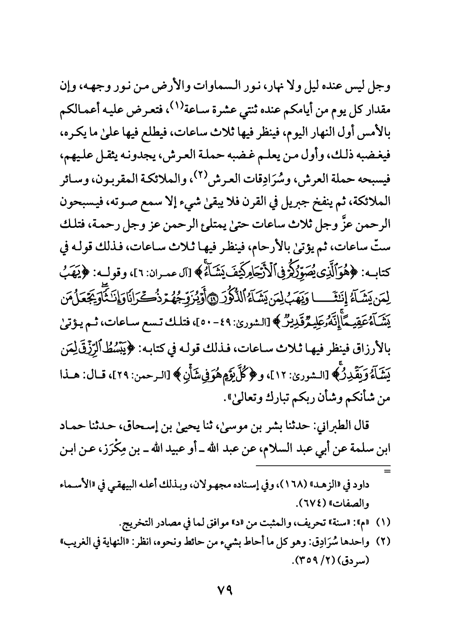 وجل ليس عنده ليل ولا نهار، نور السماوات والأرض من نور وجهه، وإن مقدار كل يوم من أيامكم عنده ثنتي عشرة ساعة (¬١)، فتعرض عليه أعمالكم بالأمس أول النهار اليوم، فينظر فيها ثلاث ساعات، فيطلع فيها على ما يكره، فيغضبه ذلك، وأول من يعلم غضبه حملة العرش، يجدونه يثقل عليهم، فيسبحه حملة العرش، وسُرَادِقات العرش (¬٢)، والملائكة المقربون، وسائر الملائكة، ثم ينفخ جبريل في القرن فلا يبقى شيء إلا سمع صوته، فيسبحون الرحمن عزَّ وجل ثلاث ساعات حتى يمتلئ الرحمن عز وجل رحمة، فتلك ستّ ساعات، ثم يؤتى بالأرحام، فينظر فيها ثلاث ساعات، فذلك قوله في كتابه: {هُوَ الَّذِي يُصَوِّرُكُمْ فِي الْأَرْحَامِ كَيْفَ يَشَاءُ} [آل عمران: ٦]، وقوله: {يَهَبُ لِمَنْ يَشَاءُ إِنَاثًا وَيَهَبُ لِمَنْ يَشَاءُ الذُّكُورَ (٤٩) أَوْ يُزَوِّجُهُمْ ذُكْرَانًا وَإِنَاثًا وَيَجْعَلُ مَنْ يَشَاءُ عَقِيمًا إِنَّهُ عَلِيمٌ قَدِيرٌ} [الشورى: ٤٩ - ٥٠]، فتلك تسع ساعات، ثم يؤتى بالأرزاق فينظر فيها ثلاث ساعات، فذلك قوله في كتابه: {يَبْسُطُ الرِّزْقَ لِمَنْ يَشَاءُ وَيَقْدِرُ} [الشورى: ١٢]، و {كُلَّ يَوْمٍ هُوَ فِي} [الرحمن: ٢٩]، قال: هذا من شأنكم وشأن ربكم تبارك وتعالى".