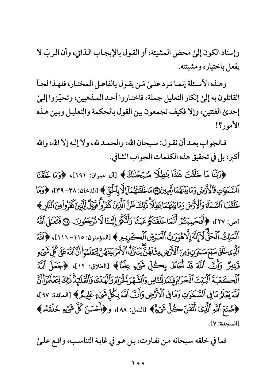 {رَبَّنَا مَا خَلَقْتَ هَذَا بَاطِلًا سُبْحَانَكَ} [آل عمران: ١٩١]، {(٣٧) وَمَا خَلَقْنَا السَّمَاوَاتِ وَالْأَرْضَ وَمَا بَيْنَهُمَا لَاعِبِينَ (٣٨) مَا خَلَقْنَاهُمَا إِلَّا} [الدخان: ٣٨ - ٣٩]، {وَمَا خَلَقْنَا السَّمَاءَ وَالْأَرْضَ وَمَا بَيْنَهُمَا بَاطِلًا ذَلِكَ ظَنُّ الَّذِينَ كَفَرُوا فَوَيْلٌ لِلَّذِينَ كَفَرُوا مِنَ النَّارِ} [ص: ٢٧]، {أَفَحَسِبْتُمْ أَنَّمَا خَلَقْنَاكُمْ عَبَثًا وَأَنَّكُمْ إِلَيْنَا لَا تُرْجَعُونَ (١١٥) فَتَعَالَى اللَّهُ الْمَلِكُ الْحَقُّ لَا إِلَهَ إِلَّا هُوَ رَبُّ الْعَرْشِ الْكَرِيمِ} [المؤمنون: ١١٥ - ١١٦]، {(١١) اللَّهُ الَّذِي خَلَقَ سَبْعَ سَمَاوَاتٍ وَمِنَ الْأَرْضِ مِثْلَهُنَّ يَتَنَزَّلُ الْأَمْرُ بَيْنَهُنَّ لِتَعْلَمُوا أَنَّ اللَّهَ عَلَى كُلِّ شَيْءٍ قَدِيرٌ وَأَنَّ اللَّهَ قَدْ أَحَاطَ بِكُلِّ شَيْءٍ عِلْمًا} [الطلاق: ١٢]، {جَعَلَ اللَّهُ الْكَعْبَةَ الْبَيْتَ الْحَرَامَ قِيَامًا لِلنَّاسِ وَالشَّهْرَ الْحَرَامَ وَالْهَدْيَ وَالْقَلَائِدَ ذَلِكَ لِتَعْلَمُوا أَنَّ اللَّهَ يَعْلَمُ مَا فِي السَّمَاوَاتِ وَمَا فِي الْأَرْضِ وَأَنَّ اللَّهَ بِكُلِّ شَيْءٍ عَلِيمٌ} [المائدة: ٩٧]، {صُنْعَ اللَّهِ الَّذِي أَتْقَنَ كُلَّ شَيْءٍ} [النمل: ٨٨]، و {أَحْسَنَ كُلَّ شَيْءٍ خَلْقَهُ} [السجدة: ٧].