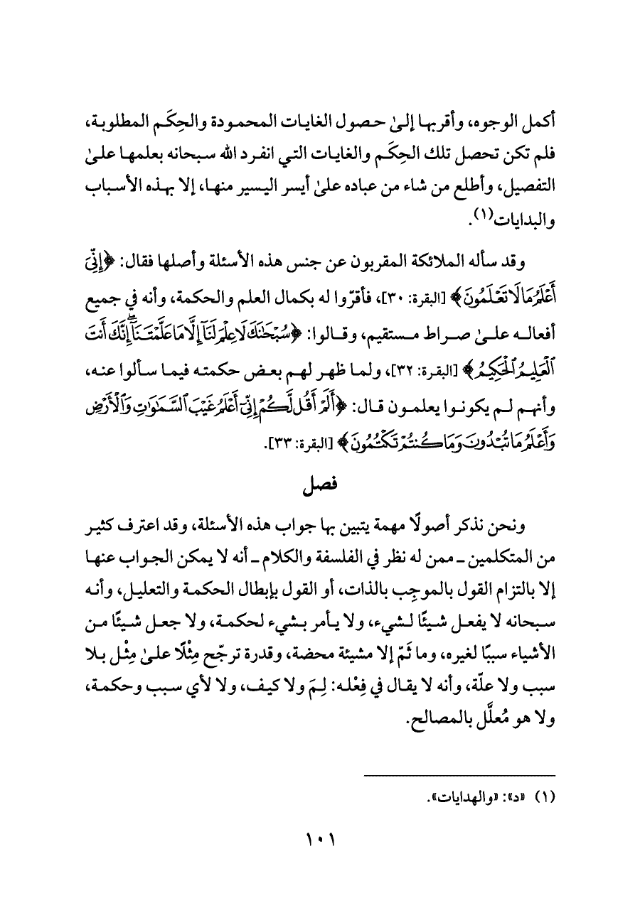 ونحن نذكر أصولًا مهمة يتبين بها جواب هذه الأسئلة، وقد اعترف كثير من المتكلمين ــ ممن له نظر في الفلسفة والكلام ــ أنه لا يمكن الجواب عنها إلا بالتزام القول بالموجِب بالذات، أو القول بإبطال الحكمة والتعليل، وأنه سبحانه لا يفعل شيئًا لشيء، ولا يأمر بشيء لحكمة، ولا جعل شيئًا من الأشياء سببًا لغيره، وما ثَمّ إلا مشيئة محضة، وقدرة ترجّح مِثْلًا على مِثْل بلا سبب ولا علّة، وأنه لا يقال في فِعْله: لِمَ ولا كيف، ولا لأي سبب وحكمة، ولا هو مُعلَّل بالمصالح.