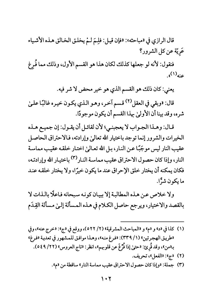 قال الرازي في «مباحثه»: «فإن قيل: فلِمَ لمْ يخلق الخالق هذه الأشياء عَرِيّة عن كل الشرور؟