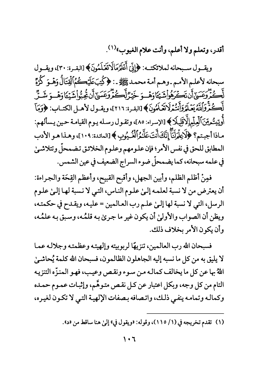 ويقول سبحانه لملائكته: {إِنِّيَ أَعْلَمُ مَا لَا تَعْلَمُونَ} [البقرة: ٣٠]، ويقول سبحانه لأعلم الأمم ـ وهم أمة محمد - صلى الله عليه وسلم - ـ: {كُتِبَ عَلَيْكُمُ الْقِتَالُ وَهْوَ كُرْهٌ لَكُمْ وَعَسَى أَنْ تَكْرَهُوا شَيْئًا وَهْوَ خَيْرٌ لَكُمْ وَعَسَى أَنْ تُحِبُّوا شَيْئًا وَهْوَ شَرٌّ لَكُمْ وَاللَّهُ يَعْلَمُ وَأَنْتُمْ لَا تَعْلَمُونَ} [البقرة: ٢١٦]، ويقول لأهل الكتاب: {أَمْرِ رَبِّي وَمَا أُوتِيتُمْ مِنَ الْعِلْمِ} [الإسراء: ٨٥]، وتقول رسله يوم القيامة حين يسألهم: ماذا أجبتم؟ {لَا عِلْمَ لَنَا إِنَّكَ أَنْتَ عَلَّامُ الْغُيُوبِ} [المائدة: ١٠٩]، وهذا هو الأدب المطابق للحق في نفس الأمر؛ فإن علومهم وعلوم الخلائق تضمحلّ وتتلاشى في علمه سبحانه، كما يضمحلّ ضوء السراج الضعيف في عين الشمس.