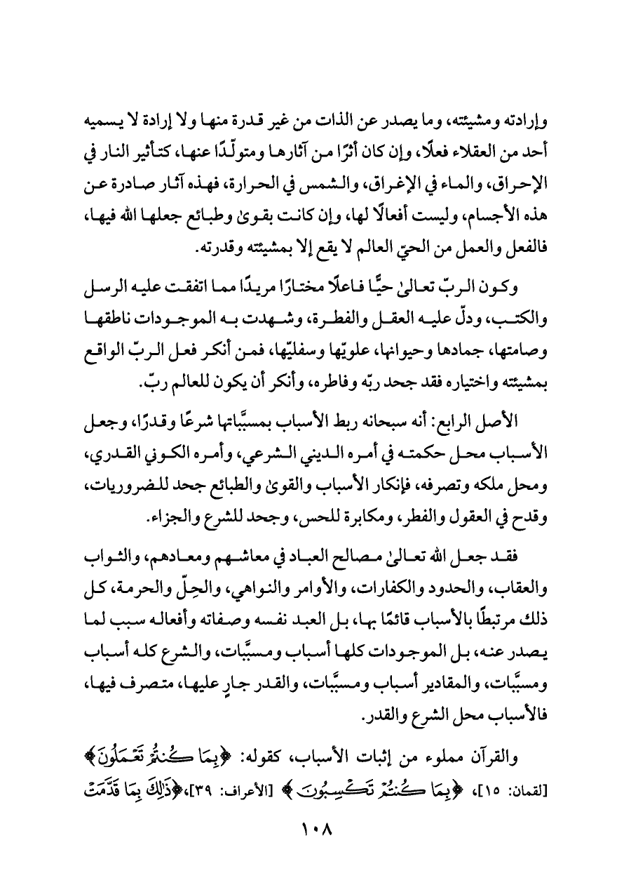 والقرآن مملوء من إثبات الأسباب، كقوله: {بِمَا كُنْتُمْ تَعْمَلُونَ} [لقمان: ١٥]، {بِمَا كُنْتُمْ تَكْسِبُونَ} [الأعراف: ٣٩]، {ذَلِكَ بِمَا قَدَّمَتْ