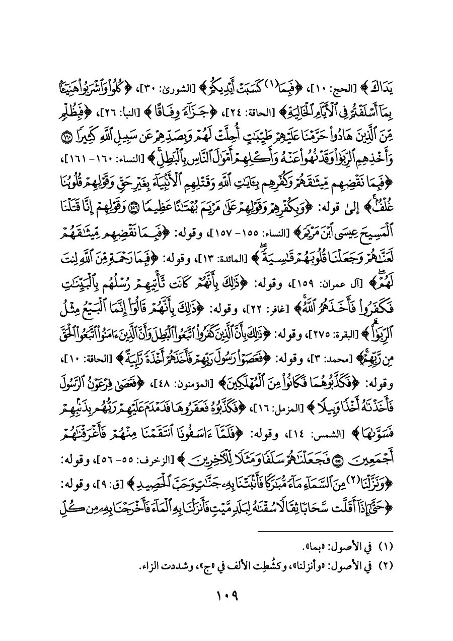 يَدَاكَ} [الحج: ١٠]، {فَبِمَا (¬١) كَسَبَتْ أَيْدِيكُمْ} [الشورى: ٣٠]، {كُلُوا وَاشْرَبُوا هَنِيئًا بِمَا أَسْلَفْتُمْ فِي الْأَيَّامِ الْخَالِيَةِ} [الحاقة: ٢٤]، {جَزَاءً وِفَاقًا} [النبأ: ٢٦]، {فَبِظُلْمٍ مِنَ الَّذِينَ هَادُوا حَرَّمْنَا عَلَيْهِمْ طَيِّبَاتٍ أُحِلَّتْ لَهُمْ وَبِصَدِّهِمْ عَنْ سَبِيلِ اللَّهِ كَثِيرًا (١٦٠) وَأَخْذِهِمِ الرِّبَا وَقَدْ نُهُوا عَنْهُ وَأَكْلِهِمْ أَمْوَالَ النَّاسِ بِالْبَاطِلِ} [النساء: ١٦٠ - ١٦١]، {فَبِمَا نَقْضِهِمْ مِيثَاقَهُمْ وَكُفْرِهِمْ بِآيَاتِ اللَّهِ وَقَتْلِهِمِ الْأَنْبِيَاءَ بِغَيْرِ حَقٍّ وَقَوْلِهِمْ قُلُوبُنَا غُلْفٌ} إلى قوله: {وَبِكُفْرِهِمْ وَقَوْلِهِمْ عَلَى مَرْيَمَ بُهْتَانًا عَظِيمًا (١٥٦) وَقَوْلِهِمْ إِنَّا قَتَلْنَا الْمَسِيحَ عِيسَى ابْنَ مَرْيَمَ} [النساء: ١٥٥ - ١٥٧]، وقوله: {فَبِمَا نَقْضِهِمْ مِيثَاقَهُمْ لَعَنَّاهُمْ وَجَعَلْنَا قُلُوبَهُمْ قَاسِيَةً} [المائدة: ١٣]، وقوله: {فَبِمَا رَحْمَةٍ مِنَ اللَّهِ لِنْتَ لَهُمْ} [آل عمران: ١٥٩]، وقوله: {ذَلِكَ بِأَنَّهُمْ كَانَتْ تَأْتِيهِمْ رُسْلُهُم بِالْبَيِّنَاتِ فَكَفَرُوا فَأَخَذَهُمُ اللَّهُ} [غافر: ٢٢]، وقوله: {ذَلِكَ بِأَنَّهُمْ قَالُوا إِنَّمَا الْبَيْعُ مِثْلُ الرِّبَا} [البقرة: ٢٧٥]، وقوله: {(٢) ذَلِكَ بِأَنَّ الَّذِينَ كَفَرُوا اتَّبَعُوا الْبَاطِلَ وَأَنَّ الَّذِينَ آمَنُوا اتَّبَعُوا الْحَقَّ مِنْ رَبِّهِمْ} [محمد: ٣]، وقوله: {فَعَصَوْا رَسُولَ رَبِّهِمْ فَأَخَذَهُمْ أَخْذَةً رَابِيَةً} [الحاقة: ١٠]،