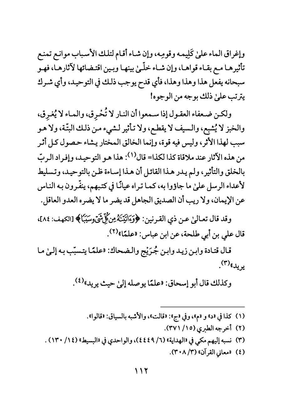 وقد قال تعالى عن ذي القرنين: {وَآتَيْنَاهُ مِنْ كُلِّ شَيْءٍ سَبَبًا} [الكهف: ٨٤]، قال علي بن أبي طلحة، عن ابن عباس: «علمًا» (¬٢).