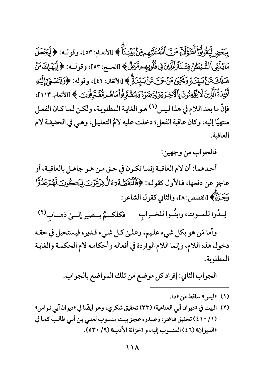 بِبَعْضٍ لِيَقُولُوا أَهَؤُلَاءِ مَنَّ اللَّهُ عَلَيْهِمْ مِنْ بَيْنِنَا} [الأنعام: ٥٣]، وقوله: {لِيَجْعَلَ مَا يُلْقِي الشَّيْطَانُ فِتْنَةً لِلَّذِينَ فِي قُلُوبِهِمْ مَرَضٌ} [الحج: ٥٣]، وقوله: {مَفْعُولًا لِيَهْلِكَ مَنْ هَلَكَ عَنْ بَيِّنَةٍ وَيَحْيَى مَنْ حَيَّ عَنْ بَيِّنَةٍ} [الأنفال: ٤٢]، وقوله: {وَلِتَصْغَى إِلَيْهِ أَفْئِدَةُ الَّذِينَ لَا يُؤْمِنُونَ بِالْآخِرَةِ وَلِيَرْضَوْهُ وَلِيَقْتَرِفُوا مَا هُمْ مُقْتَرِفُونَ} [الأنعام: ١١٣]، فإنّ ما بعد اللام في هذا ليس (¬١) هو الغاية المطلوبة، ولكن لما كان الفعل منتهيًا إليه، وكان عاقبة الفعل؛ دخلت عليه لامُ التعليل، وهي في الحقيقة لام العاقبة.