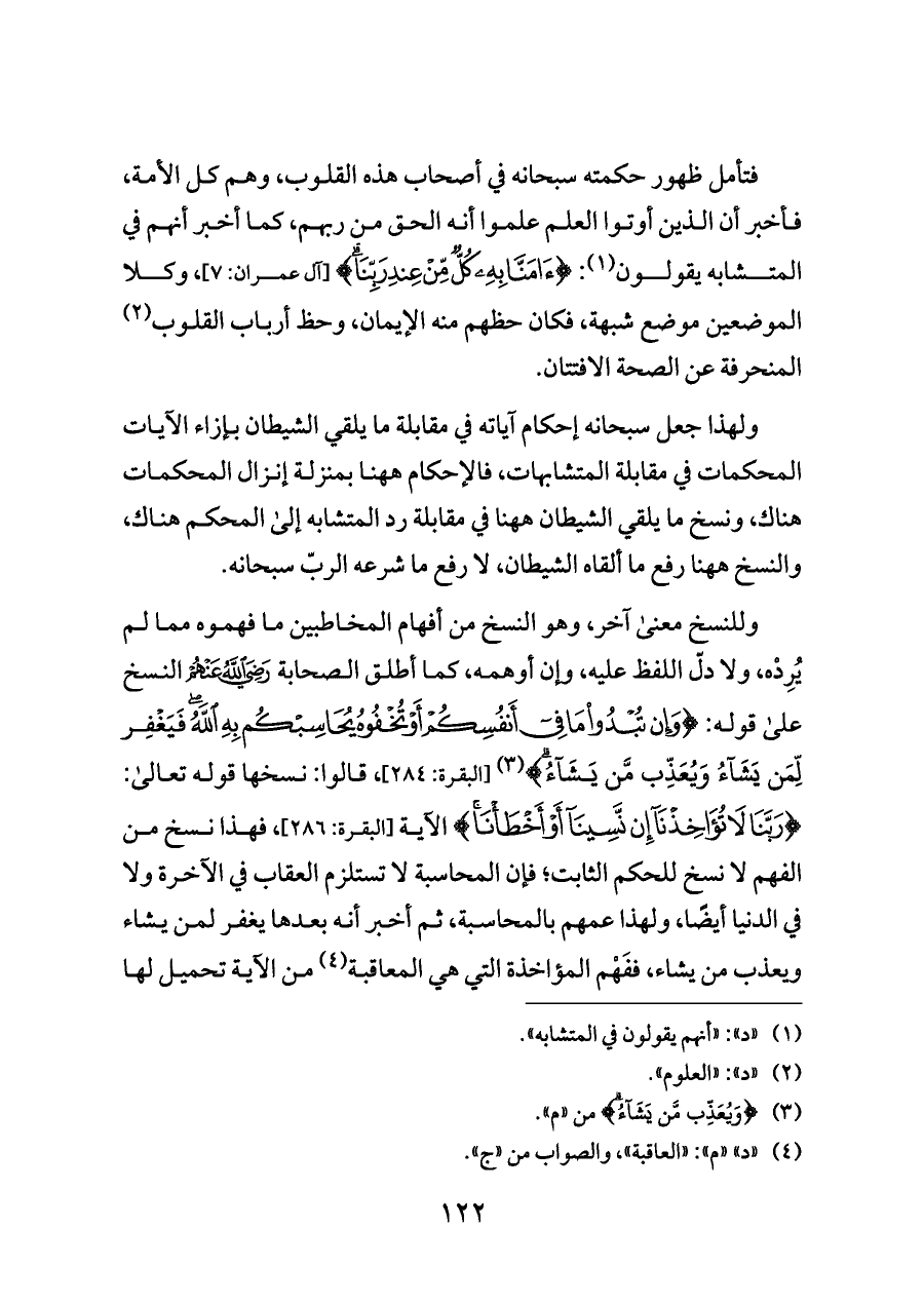 ولهذا جعل سبحانه إحكام آياته في مقابلة ما يلقي الشيطان بإزاء الآيات المحكمات في مقابلة المتشابهات، فالإحكام ههنا بمنزلة إنزال المحكمات هناك، ونسخ ما يلقي الشيطان ههنا في مقابلة رد المتشابه إلى المحكم هناك، والنسخ ههنا رفع ما ألقاه الشيطان، لا رفع ما شرعه الربّ سبحانه.
