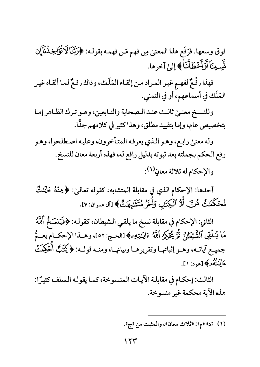 الثاني: الإحكام في مقابلة نسخ ما يلقي الشيطان، كقوله: {ا فَيَنْسَخُ اللَّهُ مَا يُلْقِي الشَّيْطَانُ ثُمَّ يُحْكِمُ اللَّهُ آيَاتِهِ} [الحج: ٥٢]، وهذا الإحكام يعمُّ جميع آياته، وهو إثباتها وتقريرها وبيانها، ومنه قوله: {كِتَابٌ أُحْكِمَتْ آيَاتُهُ} [هود: ١].