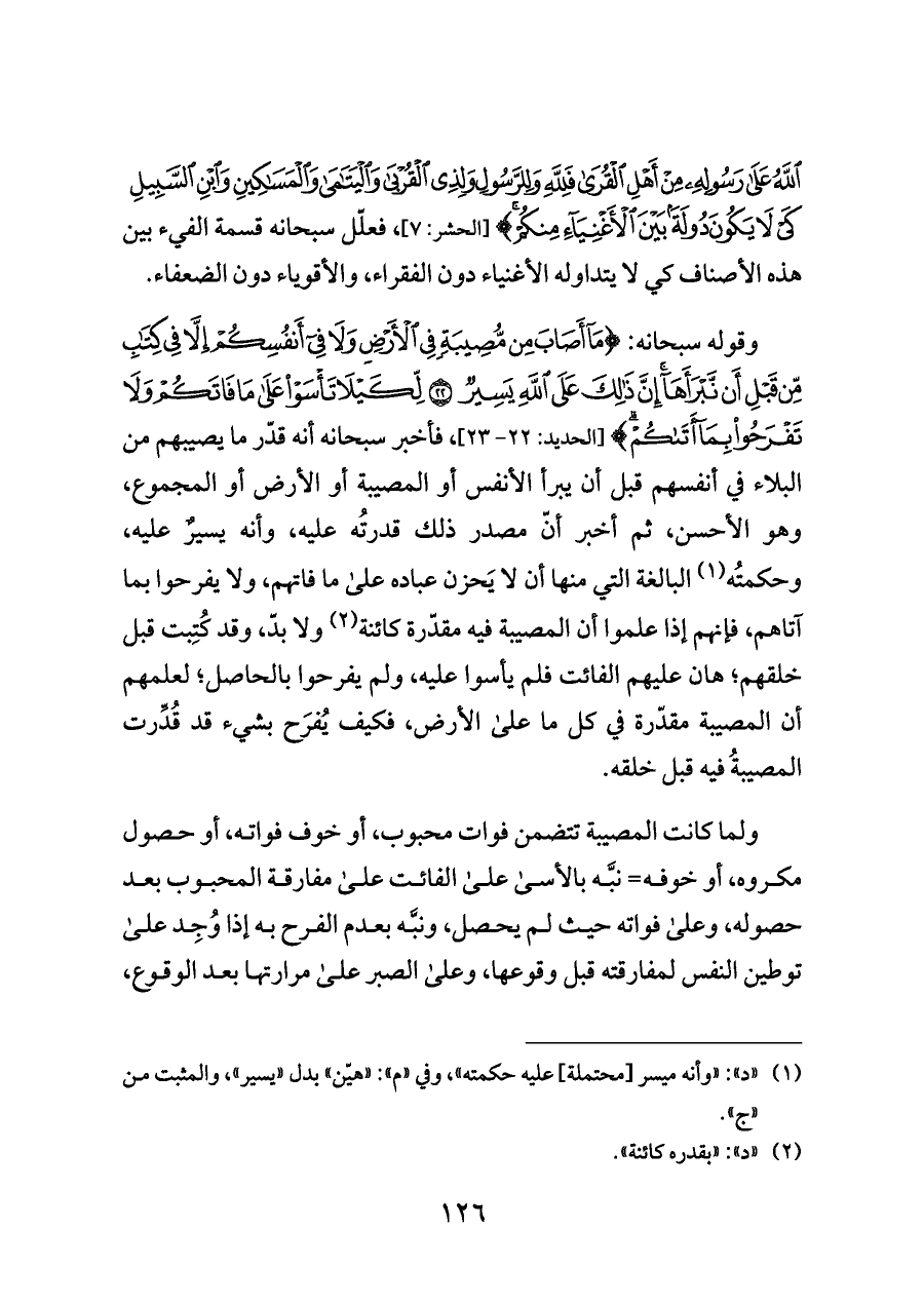 وقوله سبحانه: {مَا أَصَابَ مِنْ مُصِيبَةٍ فِي الْأَرْضِ وَلَا فِي أَنْفُسِكُمْ إِلَّا فِي كِتَابٍ مِنْ قَبْلِ أَنْ نَبْرَأَهَا إِنَّ ذَلِكَ عَلَى اللَّهِ يَسِيرٌ (٢٢) لِكَيْلَا تَأْسَوْا عَلَى مَا فَاتَكُمْ وَلَا تَفْرَحُوا بِمَا أَتَاكُمْ} [الحديد: ٢٢ - ٢٣]، فأخبر سبحانه أنه قدّر ما يصيبهم من البلاء في أنفسهم قبل أن يبرأ الأنفس أو المصيبة أو الأرض أو المجموع، وهو الأحسن، ثم أخبر أنّ مصدر ذلك قدرتُه عليه، وأنه يسيرٌ عليه، وحكمتُه (¬١) البالغة التي منها أن لا يَحزن عباده على ما فاتهم، ولا يفرحوا بما آتاهم، فإنهم إذا علموا أن المصيبة فيه مقدّرة كائنة (¬٢) ولا بدّ، وقد كُتِبت قبل خلقهم؛ هان عليهم الفائت فلم يأسوا عليه، ولم يفرحوا بالحاصل؛ لعلمهم أن المصيبة مقدّرة في كل ما على الأرض، فكيف يُفرَح بشيء قد قُدِّرت المصيبةُ فيه قبل خلقه.