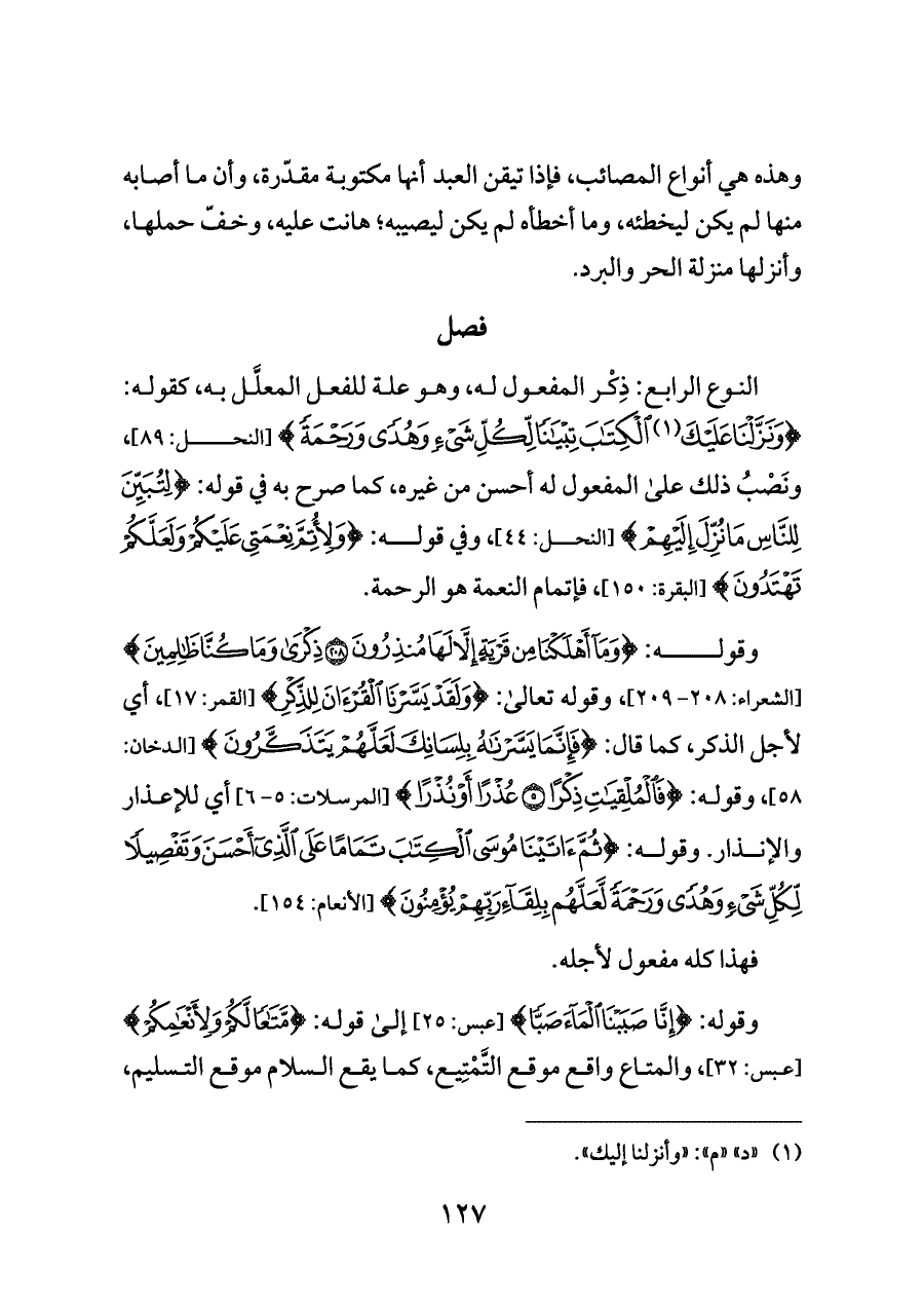 النوع الرابع: ذِكْر المفعول له، وهو علة للفعل المعلَّل به، كقوله: {وَنَزَّلْنَا عَلَيْكَ (¬١) الْكِتَابَ تِبْيَانًا لِكُلِّ شَيْءٍ وَهُدًى وَرَحْمَةً} [النحل: ٨٩]، ونَصْبُ ذلك على المفعول له أحسن من غيره، كما صرح به في قوله: {لِتُبَيِّنَ لِلنَّاسِ مَا نُزِّلَ إِلَيْهِمْ} [النحل: ٤٤]، وفي قوله: {وَاخْشَوْنِي وَلِأُتِمَّ نِعْمَتِي عَلَيْكُمْ وَلَعَلَّكُمْ} [البقرة: ١٥٠]، فإتمام النعمة هو الرحمة.