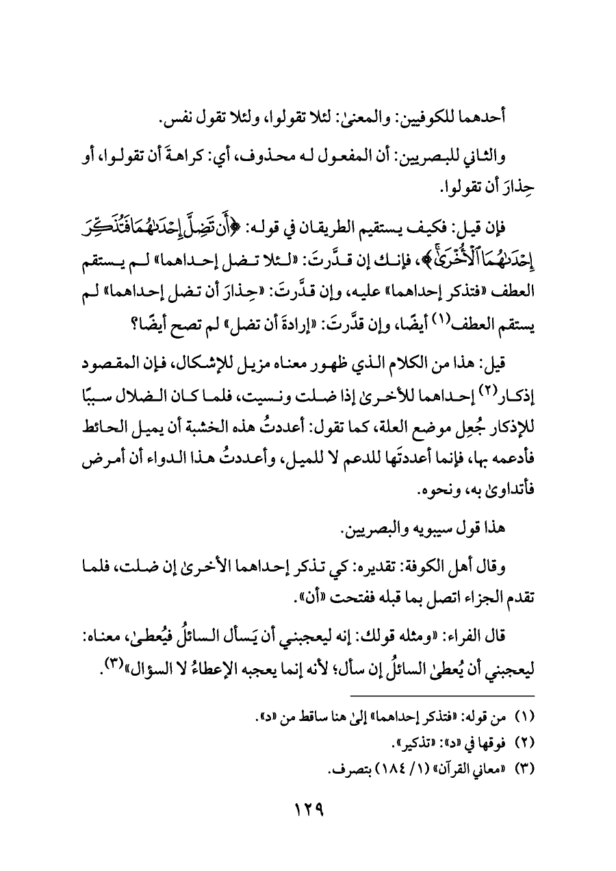 فإن قيل: فكيف يستقيم الطريقان في قوله: {أَنْ تَضِلَّ إِحْدَاهُمَا فَتُذَكِّرَ إِحْدَاهُمَا الْأُخْرَى}، فإنك إن قدَّرتَ: «لئلا تضل إحداهما» لم يستقم العطف «فتذكر إحداهما» عليه، وإن قدَّرتَ: «حِذارَ أن تضل إحداهما» لم يستقم العطف (¬١) أيضًا، وإن قدَّرتَ: «إرادةَ أن تضل» لم تصح أيضًا؟
