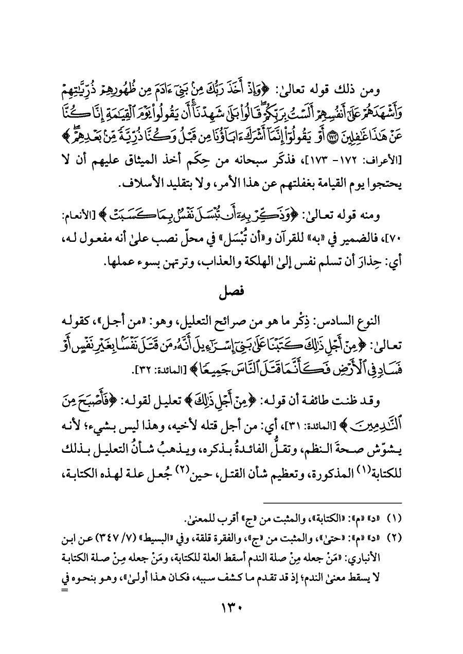 النوع السادس: ذِكْر ما هو من صرائح التعليل، وهو: «من أجل»، كقوله تعالى: {مِنْ أَجْلِ ذَلِكَ كَتَبْنَا عَلَى بَنِي إِسْرَائِيلَ أَنَّهُ مَنْ قَتَلَ نَفْسًا بِغَيْرِ نَفْسٍ أَوْ فَسَادٍ فِي الْأَرْضِ فَكَأَنَّمَا قَتَلَ النَّاسَ جَمِيعًا} [المائدة: ٣٢].