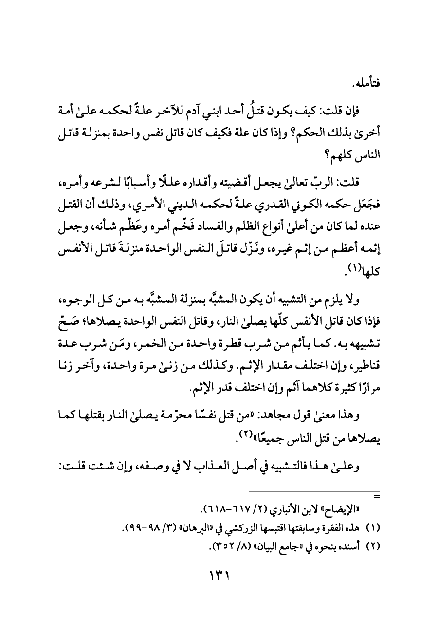 ولا يلزم من التشبيه أن يكون المشبَّه بمنزلة المشبَّه به من كل الوجوه، فإذا كان قاتل الأنفس كلّها يصلى النار، وقاتل النفس الواحدة يصلاها؛ صَحّ تشبيهه به. كما يأثم من شرب قطرة واحدة من الخمر، ومَن شرب عدة قناطير، وإن اختلف مقدار الإثم. وكذلك من زنى مرة واحدة، وآخر زنا مرارًا كثيرة كلاهما آثم وإن اختلف قدر الإثم.