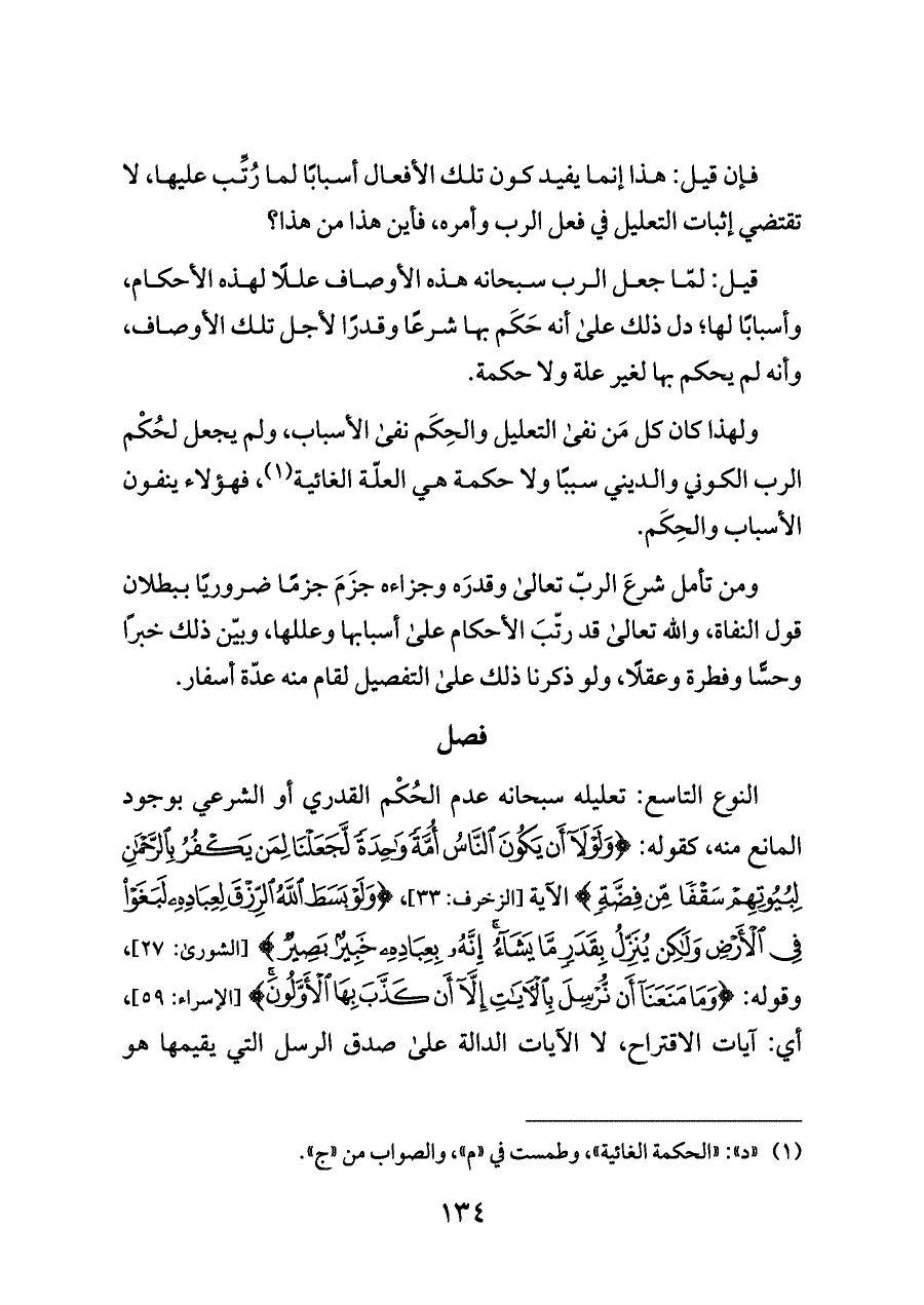 ولهذا كان كل مَن نفى التعليل والحِكَم نفى الأسباب، ولم يجعل لحُكْم الرب الكوني والديني سببًا ولا حكمة هي العلّة الغائية (¬١)، فهؤلاء ينفون الأسباب والحِكَم.