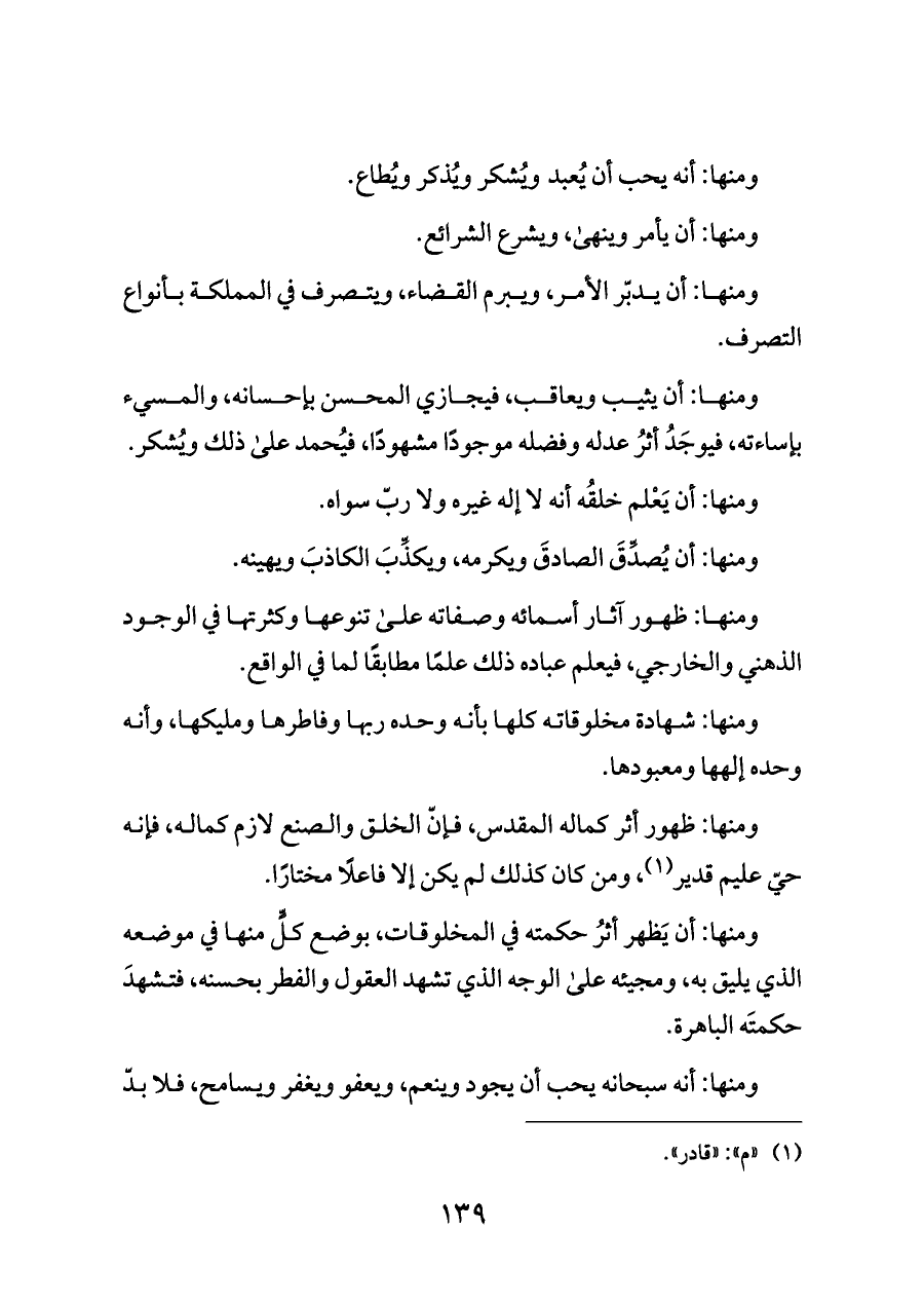 ومنها: ظهور أثر كماله المقدس، فإنّ الخلق والصنع لازم كماله، فإنه حيّ عليم قدير (¬١)، ومن كان كذلك لم يكن إلا فاعلًا مختارًا.