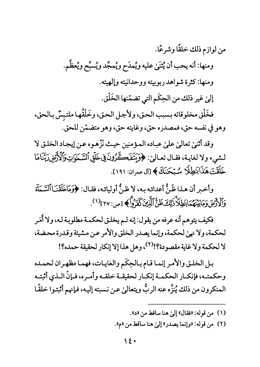 وقد أثنى تعالى على عباده المؤمنين حيث نَزّهوه عن إيجاد الخلق لا لشيء ولا لغاية، فقال تعالى: {وَيَتَفَكَّرُونَ فِي خَلْقِ السَّمَاوَاتِ وَالْأَرْضِ رَبَّنَا مَا خَلَقْتَ هَذَا بَاطِلًا سُبْحَانَكَ} [آل عمران: ١٩١].