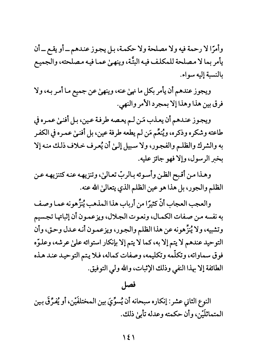 والعجب العجاب أنّ كثيرًا من أرباب هذا المذهب يُنزِّهونه عما وصف به نفسه من صفات الكمال، ونعوت الجلال، ويزعمون أن إثباتها تجسيم وتشبيه، ولا يُنزِّهونه عن هذا الظلم والجور، ويزعمون أنه عدل وحق، وأن التوحيد عندهم لا يتم إلا به، كما لا يتم إلا بإنكار استوائه على عرشه، وعلوّه فوق سماواته، وتكلّمه وتكليمه، وصفات كماله، فلا يتم التوحيد عند هذه الطائفة إلا بهذا النفي وذلك الإثبات، والله ولي التوفيق.