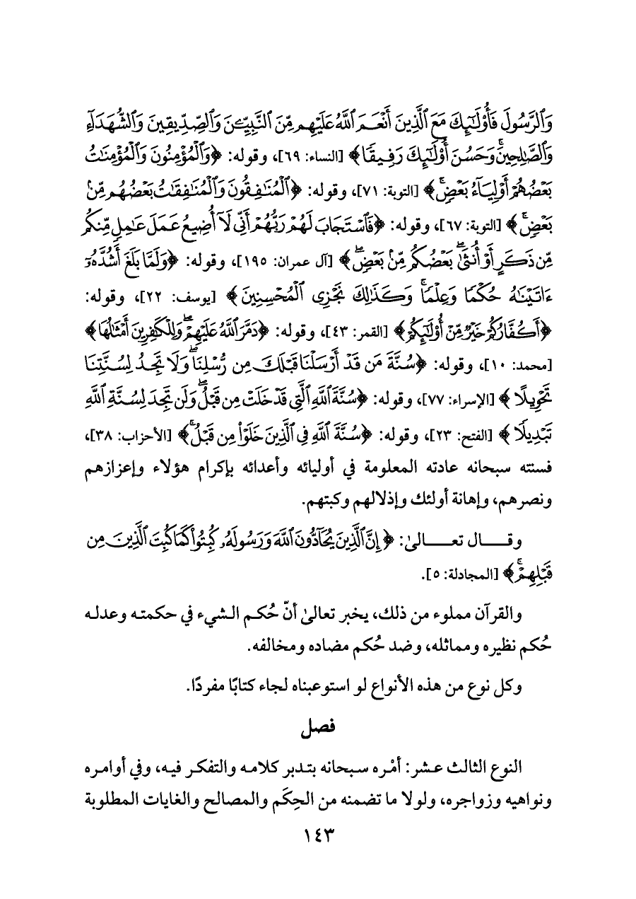 وَالرَّسُولَ فَأُولَئِكَ مَعَ الَّذِينَ أَنْعَمَ اللَّهُ عَلَيْهِمْ مِنَ النَّبِيِّينَ وَالصِّدِّيقِينَ وَالشُّهَدَاءِ وَالصَّالِحِينَ وَحَسُنَ أُولَئِكَ رَفِيقًا} [النساء: ٦٩]، وقوله: {وَالْمُؤْمِنُونَ وَالْمُؤْمِنَاتُ بَعْضُهُمْ أَوْلِيَاءُ بَعْضٍ} [التوبة: ٧١]، وقوله: {الْمُنَافِقُونَ وَالْمُنَافِقَاتُ بَعْضُهُمْ مِنْ بَعْضٍ} [التوبة: ٦٧]، وقوله: {فَاسْتَجَابَ لَهُمْ رَبُّهُمْ أَنِّي لَا أُضِيعُ عَمَلَ عَامِلٍ مِنْكُمْ مِنْ ذَكَرٍ أَوْ أُنْثَى بَعْضُكُمْ مِنْ بَعْضٍ} [آل عمران: ١٩٥]، وقوله: {وَلَمَّا بَلَغَ أَشُدَّهُ آتَيْنَاهُ حُكْمًا وَعِلْمًا وَكَذَلِكَ نَجْزِي الْمُحْسِنِينَ} [يوسف: ٢٢]، وقوله: {أَكُفَّارُكُمْ خَيْرٌ مِنْ أُولَئِكُمْ} [القمر: ٤٣]، وقوله: {دَمَّرَ اللَّهُ عَلَيْهِمْ وَلِلْكَافِرِينَ أَمْثَالُهَا} [محمد: ١٠]، وقوله: {سُنَّةَ مَنْ قَدْ أَرْسَلْنَا قَبْلَكَ مِنْ رُّسْلِنَا وَلَا تَجِدُ لِسُنَّتِنَا تَحْوِيلًا} [الإسراء: ٧٧]، وقوله: {سُنَّةَ اللَّهِ الَّتِي قَدْ خَلَتْ مِنْ قَبْلُ وَلَنْ تَجِدَ لِسُنَّةِ اللَّهِ تَبْدِيلًا} [الفتح: ٢٣]، وقوله: {سُنَّةَ اللَّهِ فِي الَّذِينَ خَلَوْا مِنْ قَبْلُ} [الأحزاب: ٣٨]، فسنته سبحانه عادته المعلومة في أوليائه وأعدائه بإكرام هؤلاء وإعزازهم ونصرهم، وإهانة أولئك وإذلالهم وكبتهم.