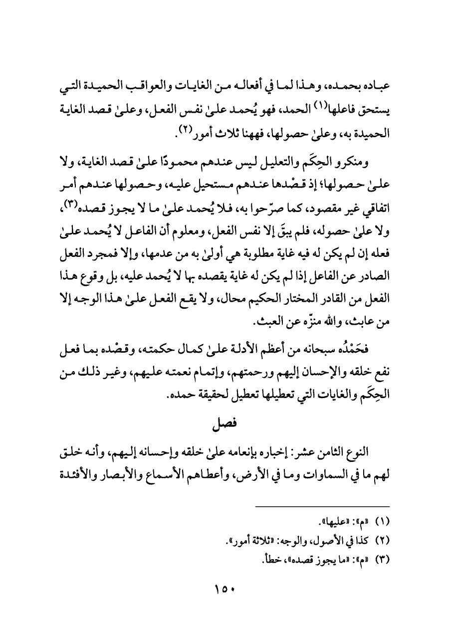 ومنكرو الحِكَم والتعليل ليس عندهم محمودًا على قصد الغاية، ولا على حصولها؛ إذ قصْدها عندهم مستحيل عليه، وحصولها عندهم أمر اتفاقي غير مقصود، كما صرّحوا به، فلا يُحمد على ما لا يجوز قصده (¬٣)، ولا على حصوله، فلم يبقَ إلا نفس الفعل، ومعلوم أن الفاعل لا يُحمد على فعله إن لم يكن له فيه غاية مطلوبة هي أولى به من عدمها، وإلا فمجرد الفعل الصادر عن الفاعل إذا لم يكن له غاية يقصده بها لا يُحمد عليه، بل وقوع هذا الفعل من القادر المختار الحكيم محال، ولا يقع الفعل على هذا الوجه إلا من عابث، والله منزّه عن العبث.