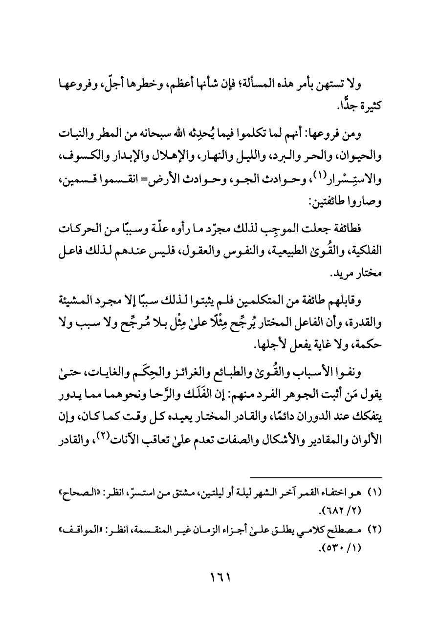 ومن فروعها: أنهم لما تكلموا فيما يُحدِثه الله سبحانه من المطر والنبات والحيوان، والحر والبرد، والليل والنهار، والإهلال والإبدار والكسوف، والاستِسْرار (¬١)، وحوادث الجو، وحوادث الأرض= انقسموا قسمين، وصاروا طائفتين: