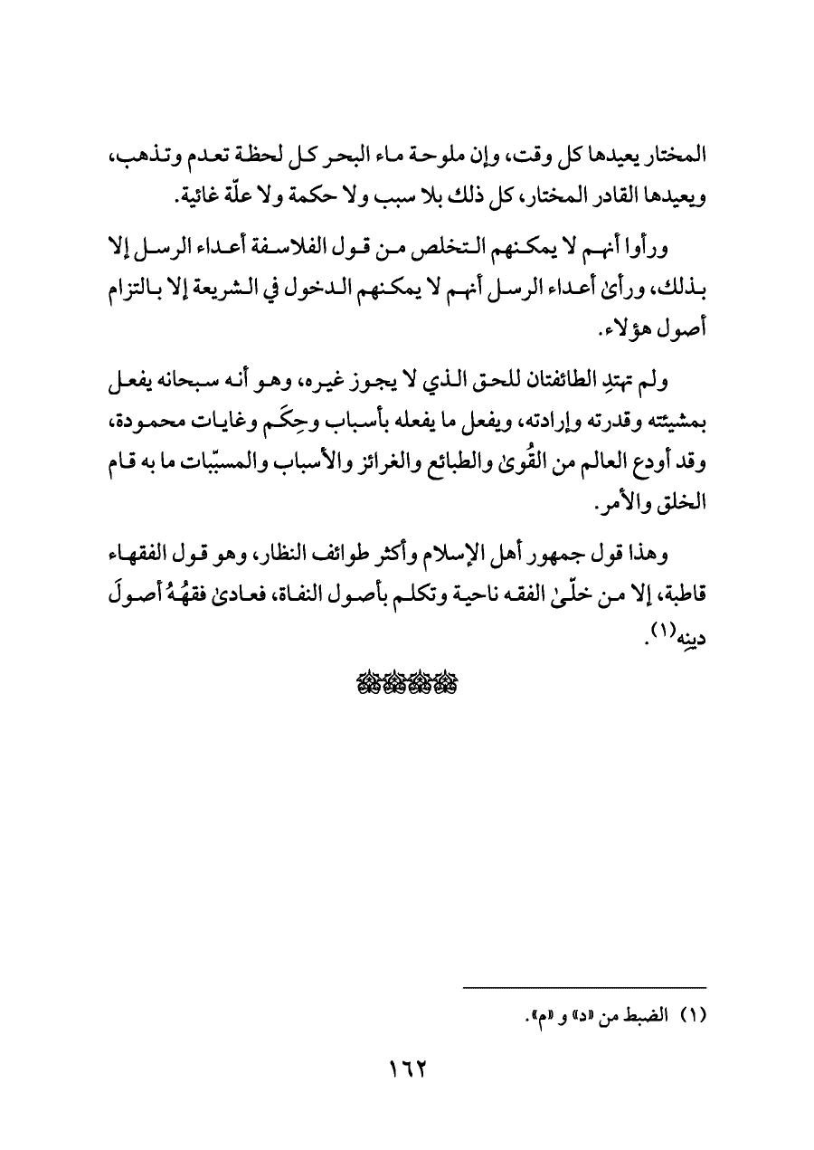 ولم تهتدِ الطائفتان للحق الذي لا يجوز غيره، وهو أنه سبحانه يفعل بمشيئته وقدرته وإرادته، ويفعل ما يفعله بأسباب وحِكَم وغايات محمودة، وقد أودع العالم من القُوى والطبائع والغرائز والأسباب والمسبّبات ما به قام الخلق والأمر.