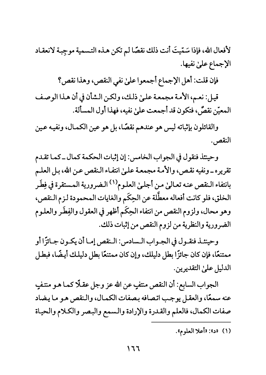 وحينئذ فنقول في الجواب الخامس: إن إثبات الحكمة كمال ــ كما تقدم تقريره ــ ونفيه نقص، والأمة مجمعة على انتفاء النقص عن الله، بل العلم بانتفاء النقص عنه تعالى من أجلى العلوم (¬١) الضرورية المستقرة في فِطَر الخلق، فلو كانت أفعاله معطَّلة عن الحِكَم والغايات المحمودة لزم النقص، وهو محال، ولزوم النقص من انتفاء الحِكَم أظهر في العقول والفِطَر والعلوم الضرورية والنظرية من لزوم النقص من إثبات ذلك.