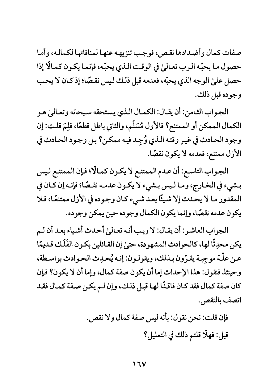 الجواب الثامن: أن يقال: الكمال الذي يستحقه سبحانه وتعالى هو الكمال الممكن أو الممتنع؟ فالأول مُسَلّم، والثاني باطل قطعًا، فلِمَ قلت: إن وجود الحادث في غير وقته الذي وُجِد فيه ممكن؟ بل وجود الحادث في الأزل ممتنع، فعدمه لا يكون نقصًا.