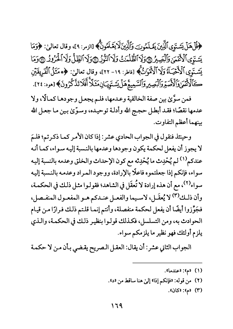 الجواب الثاني عشر: أن يقال: العقل الصريح يقضي بأن من لا حكمة