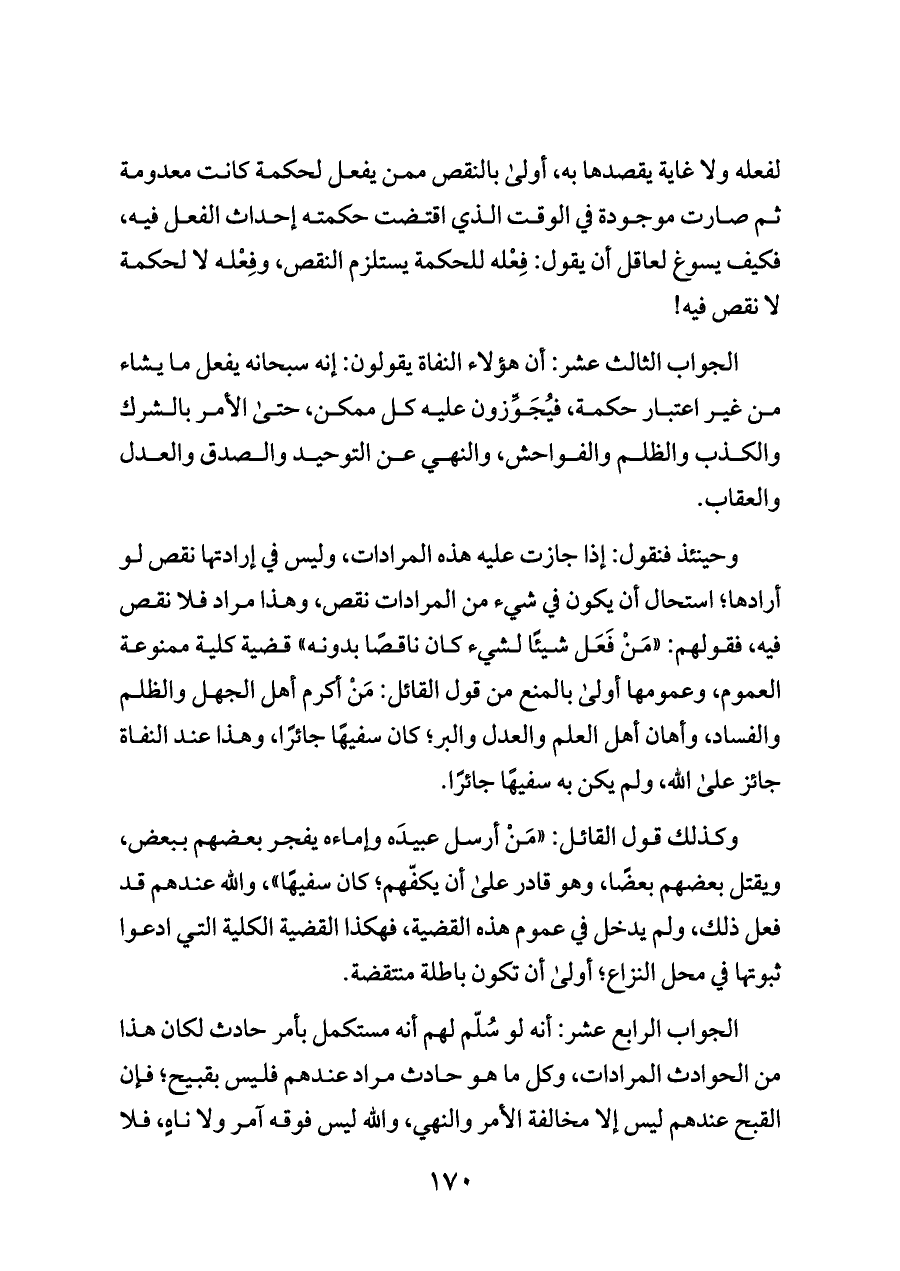 وحينئذ فنقول: إذا جازت عليه هذه المرادات، وليس في إرادتها نقص لو أرادها؛ استحال أن يكون في شيء من المرادات نقص، وهذا مراد فلا نقص فيه، فقولهم: «مَنْ فَعَل شيئًا لشيء كان ناقصًا بدونه» قضية كلية ممنوعة العموم، وعمومها أولى بالمنع من قول القائل: مَنْ أكرم أهل الجهل والظلم والفساد، وأهان أهل العلم والعدل والبر؛ كان سفيهًا جائرًا، وهذا عند النفاة جائز على الله، ولم يكن به سفيهًا جائرًا.
