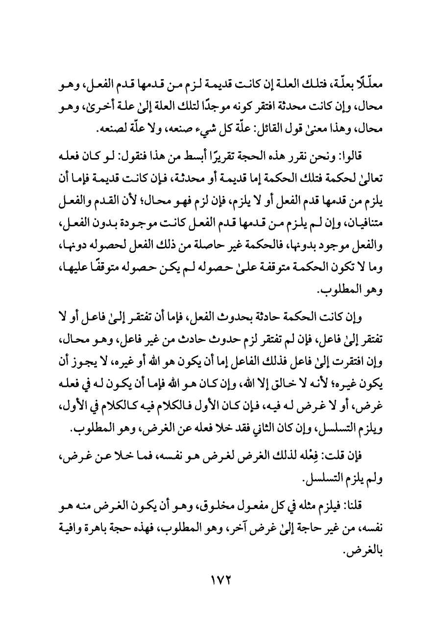 قالوا: ونحن نقرر هذه الحجة تقريرًا أبسط من هذا فنقول: لو كان فعله تعالى لحكمة فتلك الحكمة إما قديمة أو محدثة، فإن كانت قديمة فإما أن يلزم من قدمها قدم الفعل أو لا يلزم، فإن لزم فهو محال؛ لأن القدم والفعل متنافيان، وإن لم يلزم من قدمها قدم الفعل كانت موجودة بدون الفعل، والفعل موجود بدونها، فالحكمة غير حاصلة من ذلك الفعل لحصوله دونها، وما لا تكون الحكمة متوقفة على حصوله لم يكن حصوله متوقفًا عليها، وهو المطلوب.