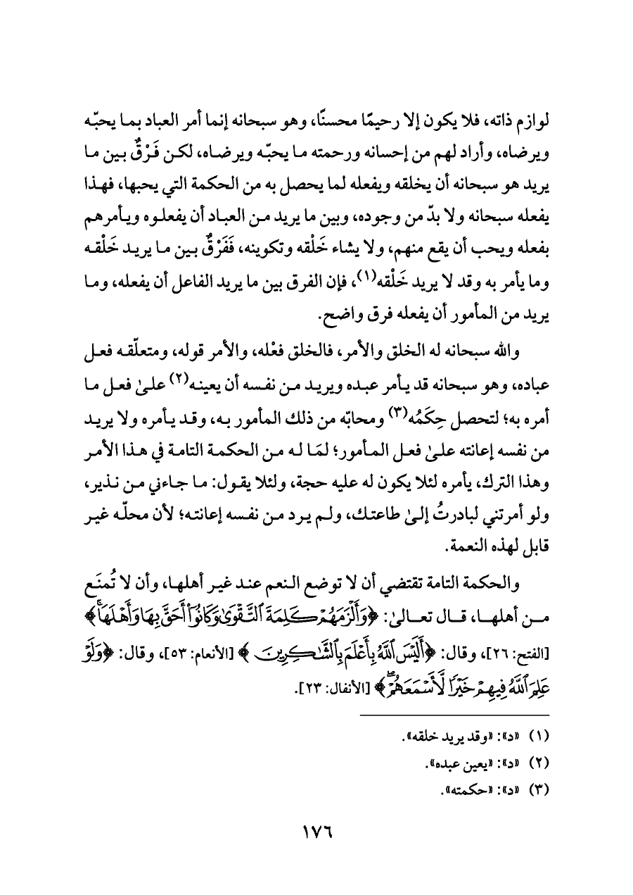 لوازم ذاته، فلا يكون إلا رحيمًا محسنًا، وهو سبحانه إنما أمر العباد بما يحبّه ويرضاه، وأراد لهم من إحسانه ورحمته ما يحبّه ويرضاه، لكن فَرْقٌ بين ما يريد هو سبحانه أن يخلقه ويفعله لما يحصل به من الحكمة التي يحبها، فهذا يفعله سبحانه ولا بدّ من وجوده، وبين ما يريد من العباد أن يفعلوه ويأمرهم بفعله ويحب أن يقع منهم، ولا يشاء خَلْقه وتكوينه، فَفَرْقٌ بين ما يريد خَلْقه وما يأمر به وقد لا يريد خَلْقه (¬١)، فإن الفرق بين ما يريد الفاعل أن يفعله، وما يريد من المأمور أن يفعله فرق واضح.