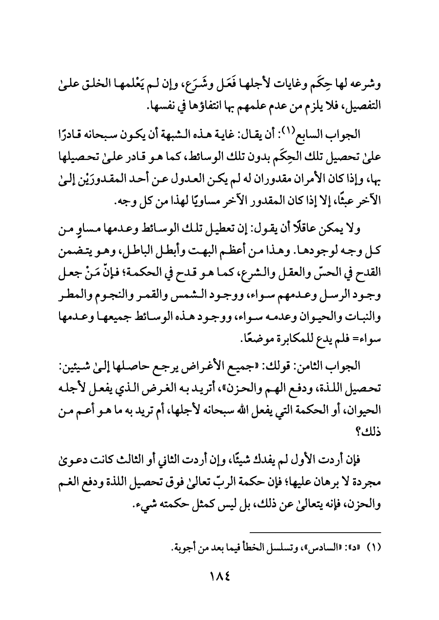 الجواب السابع (¬١): أن يقال: غاية هذه الشبهة أن يكون سبحانه قادرًا على تحصيل تلك الحِكَم بدون تلك الوسائط، كما هو قادر على تحصيلها بها، وإذا كان الأمران مقدوران له لم يكن العدول عن أحد المقدورَيْن إلى الآخر عبثًا، إلا إذا كان المقدور الآخر مساويًا لهذا من كل وجه.