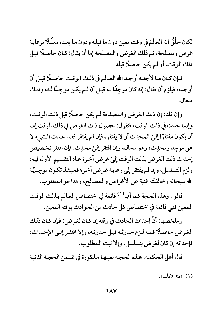 قالوا: وهذه الحجة كما أنها (¬١) قائمة في اختصاص العالم بذلك الوقت المعين فهي قائمة في اختصاص كل حادث من الحوادث بوقته المعين.