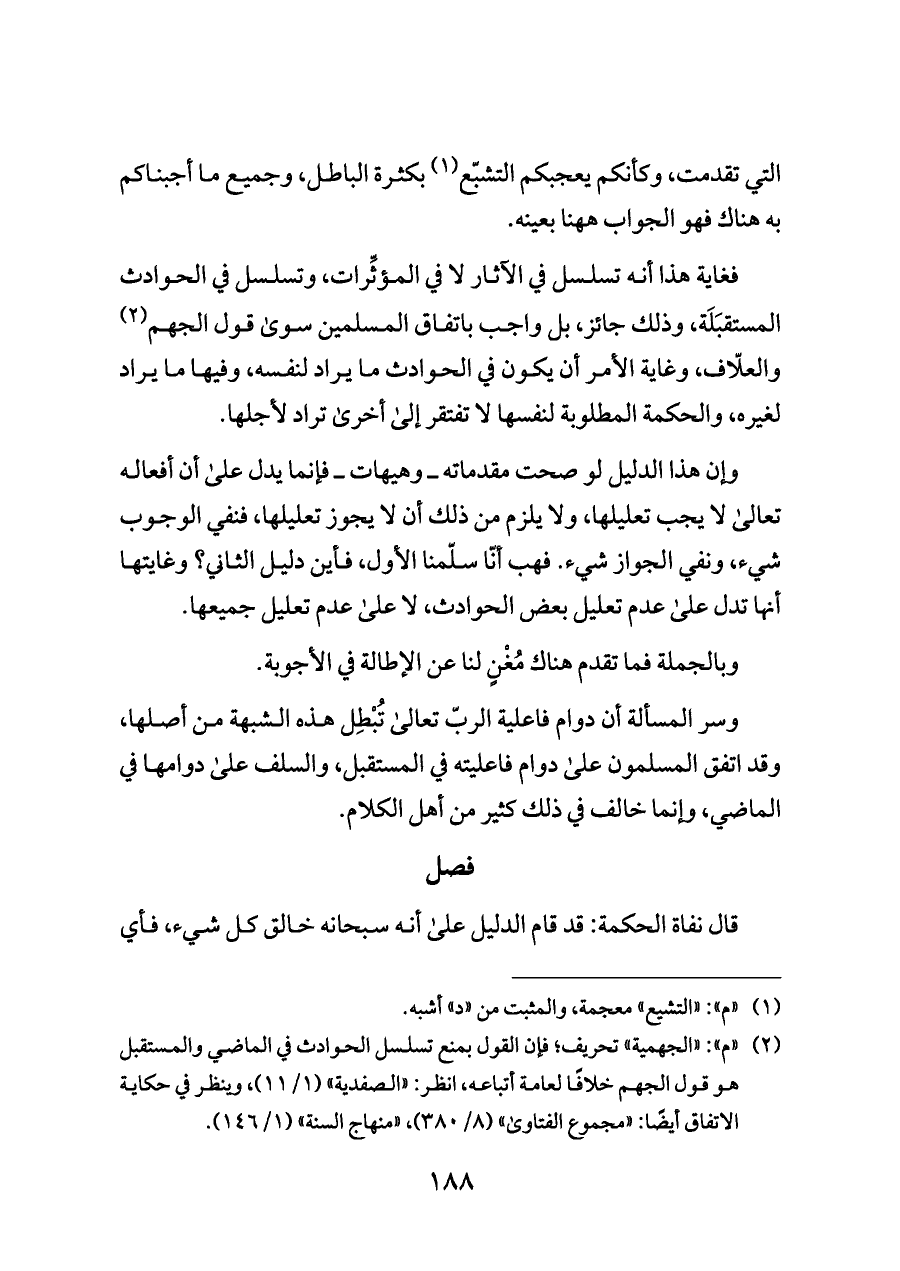 فغاية هذا أنه تسلسل في الآثار لا في المؤثِّرات، وتسلسل في الحوادث المستقبَلَة، وذلك جائز، بل واجب باتفاق المسلمين سوى قول الجهم (¬٢) والعلّاف، وغاية الأمر أن يكون في الحوادث ما يراد لنفسه، وفيها ما يراد لغيره، والحكمة المطلوبة لنفسها لا تفتقر إلى أخرى تراد لأجلها.